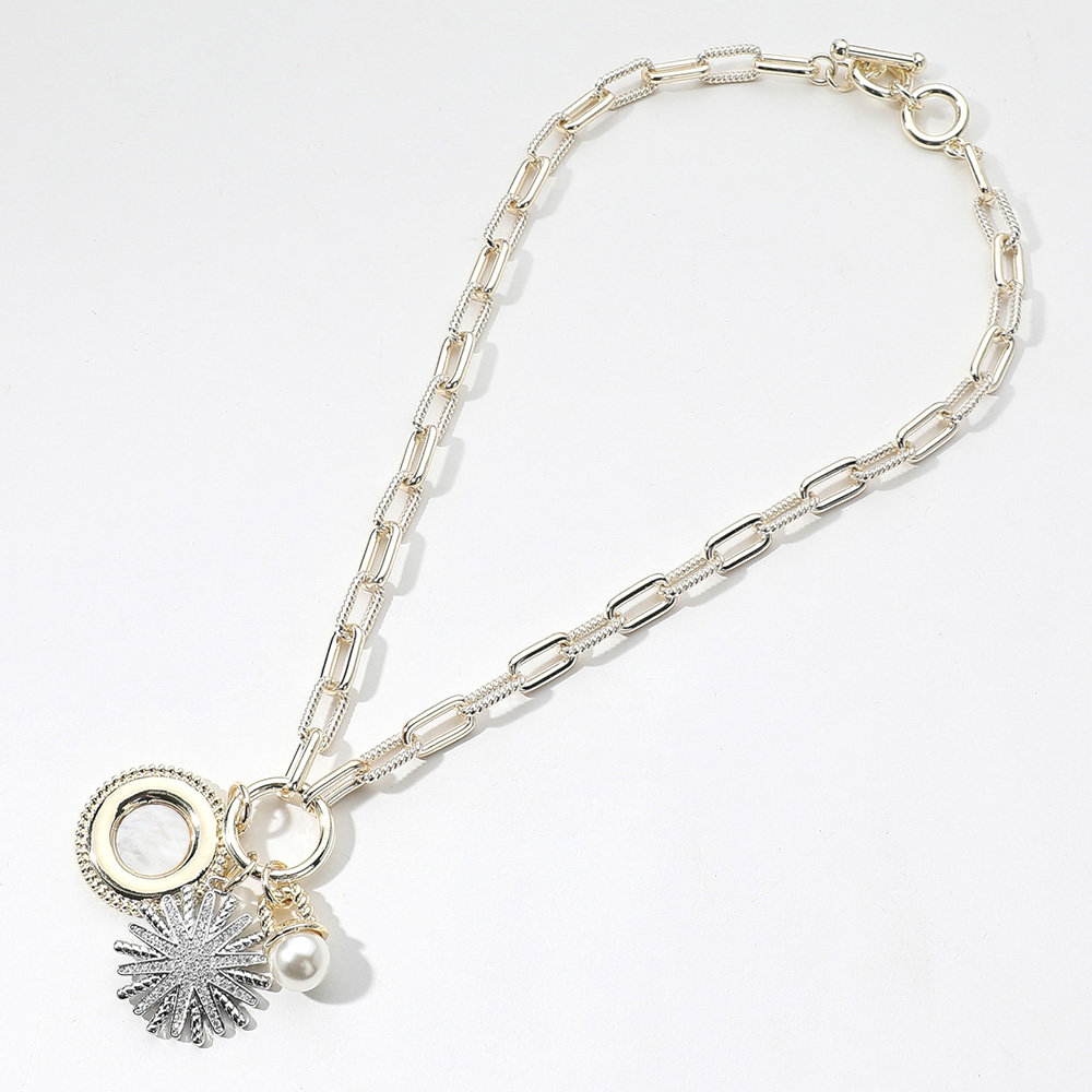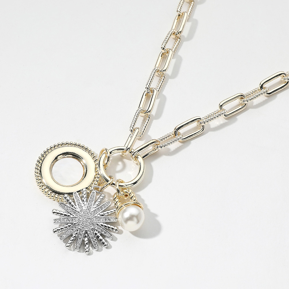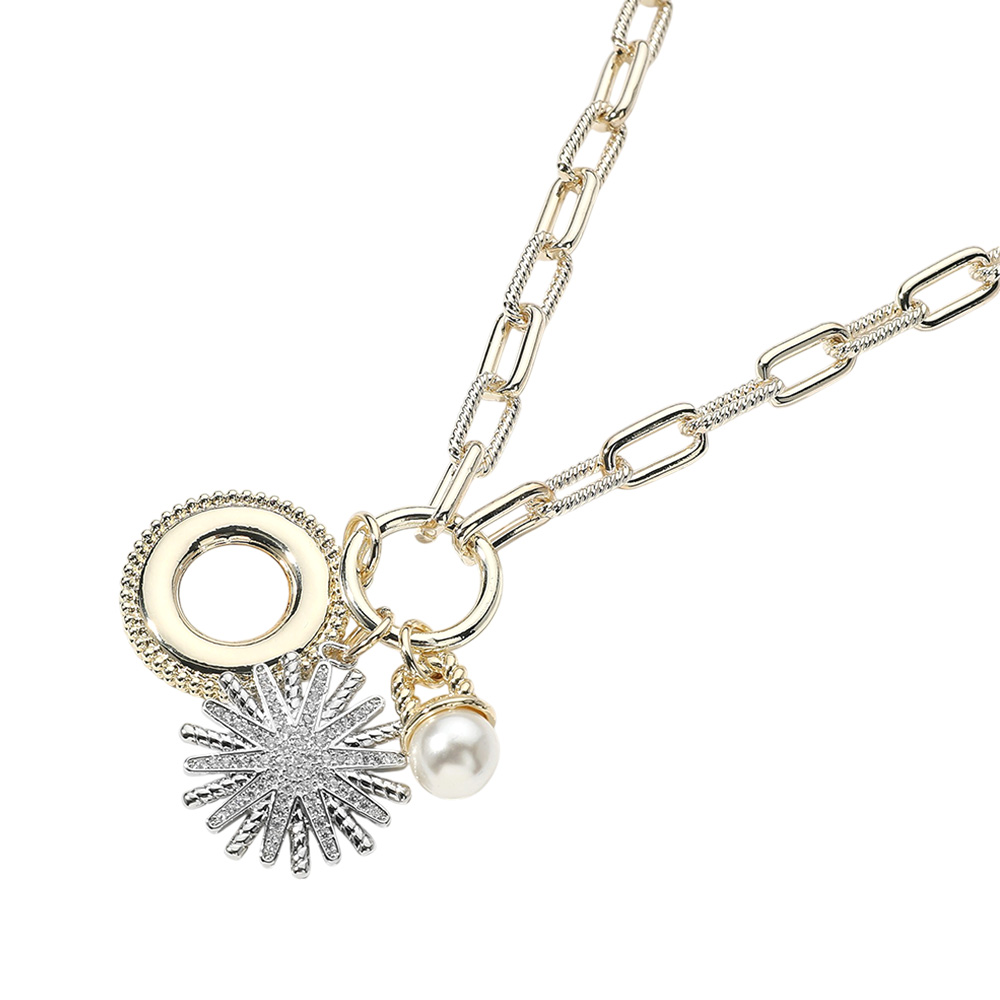 Details • Necklace Size : 16.5" + 1" L • Pendant Size : 1.75" L • This two-tone pendant necklace features a unique blend of modern and classic design, with geometric accents, a lustrous pearl charm, and a textured sunburst pendant. Its stylish chain and versatile look make it the perfect accessory for both casual outfits and elegant occasions. • Gold Dipped • CZ Cubic Zirconia