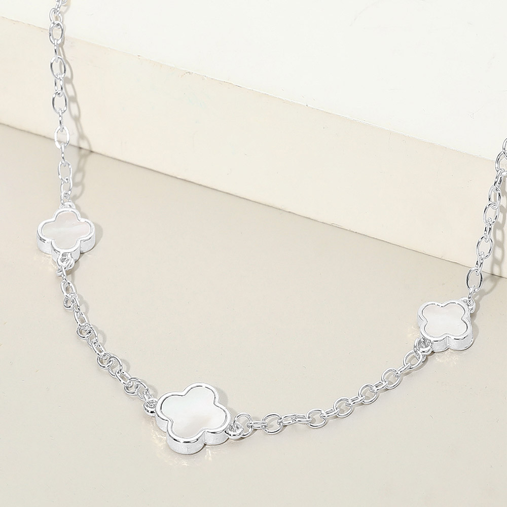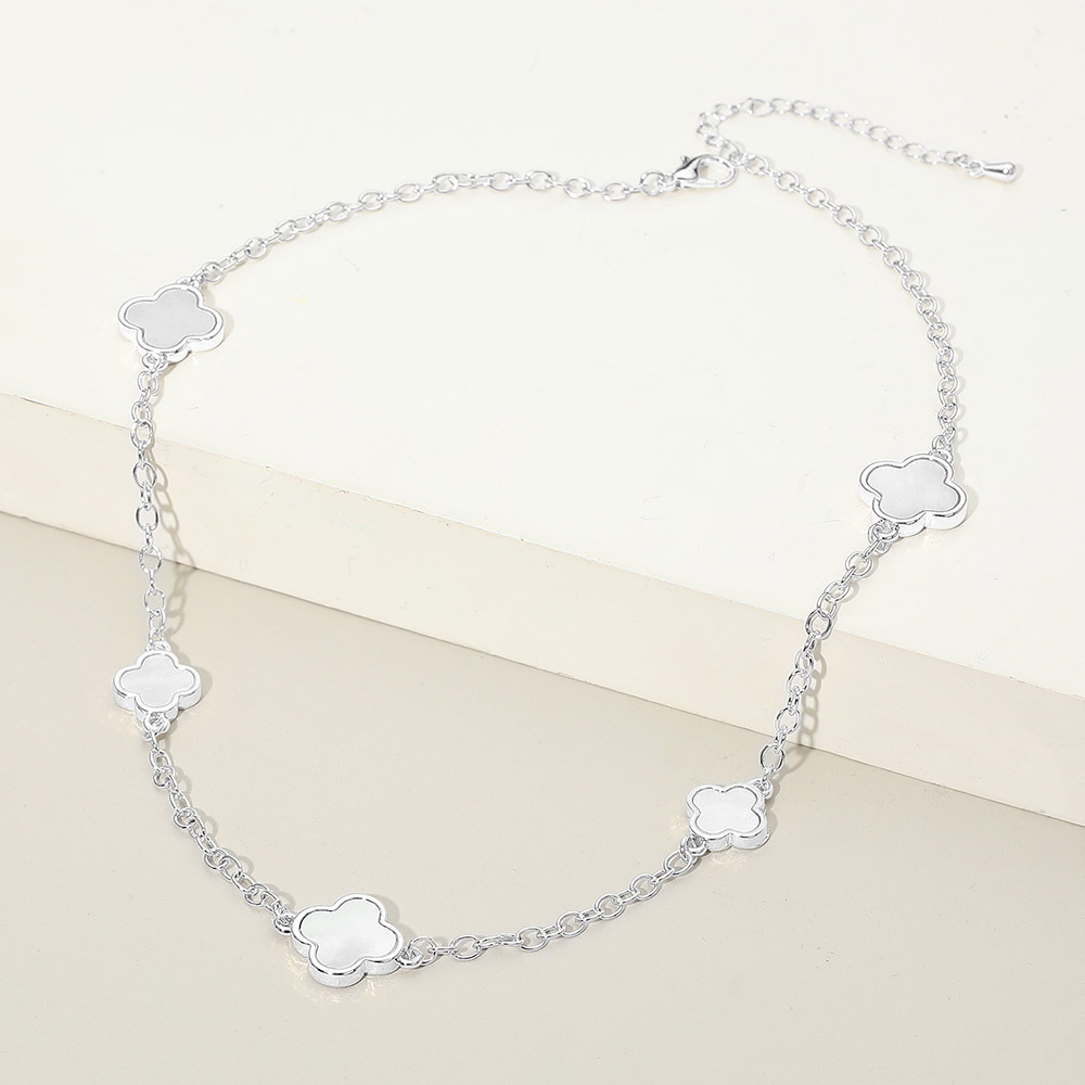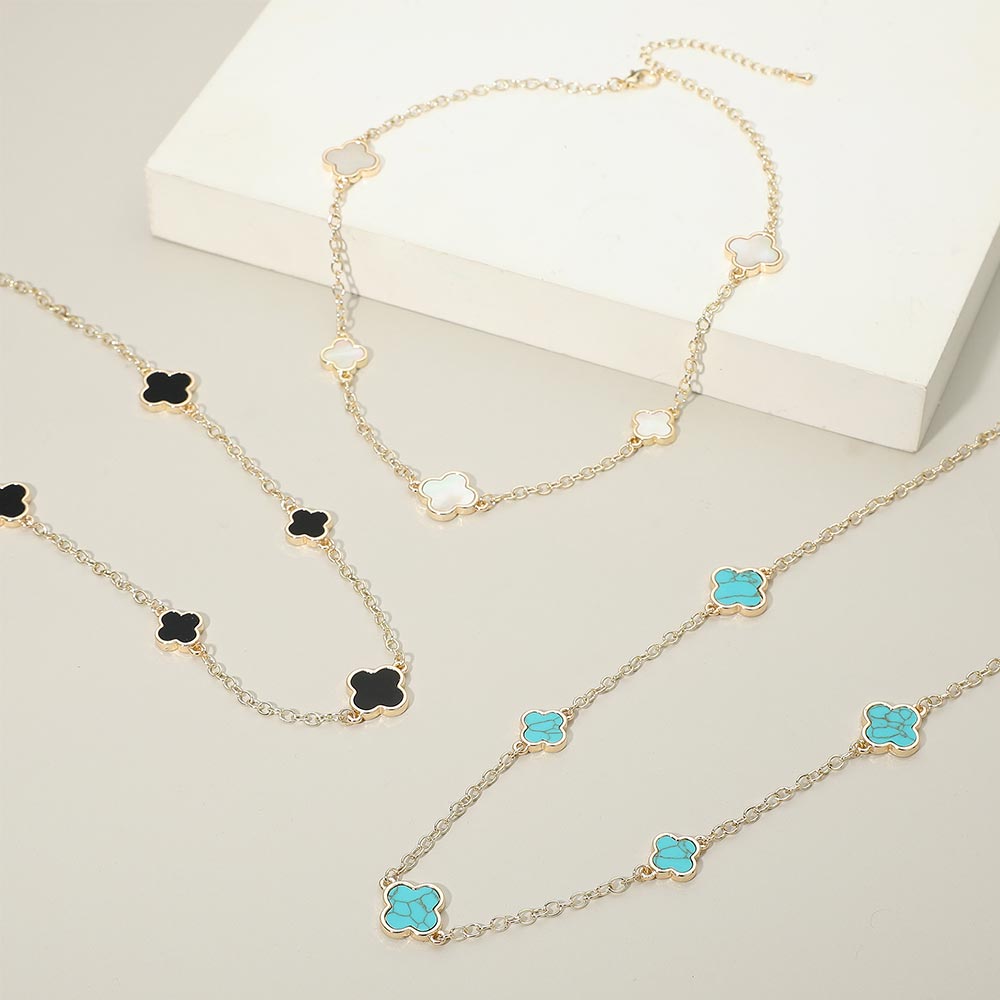 Details • Necklace Size : 16.5" + 2" L • Decor Size : 0.6" L • Elevate your style with this chic quatrefoil station necklace, crafted with a sleek silhouette and timeless charm. Its delicate linked design offers a refined accent for both casual and elegant looks, making it an effortless piece to layer or wear alone for everyday sophistication. • Gold Dipped