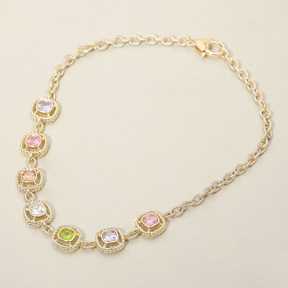 Details • Necklace Size : 17.5" + 2" L • Decor Size : 0.7" L • Brighten any outfit with this elegant chain necklace featuring a row of sparkling decorative stones set in ornate frames. Its refined yet vibrant design adds a touch of charm to both casual and dressy looks, making it a versatile accessory for everyday wear or special occasions. • CZ Cubic Zirconia • Gold Dipped