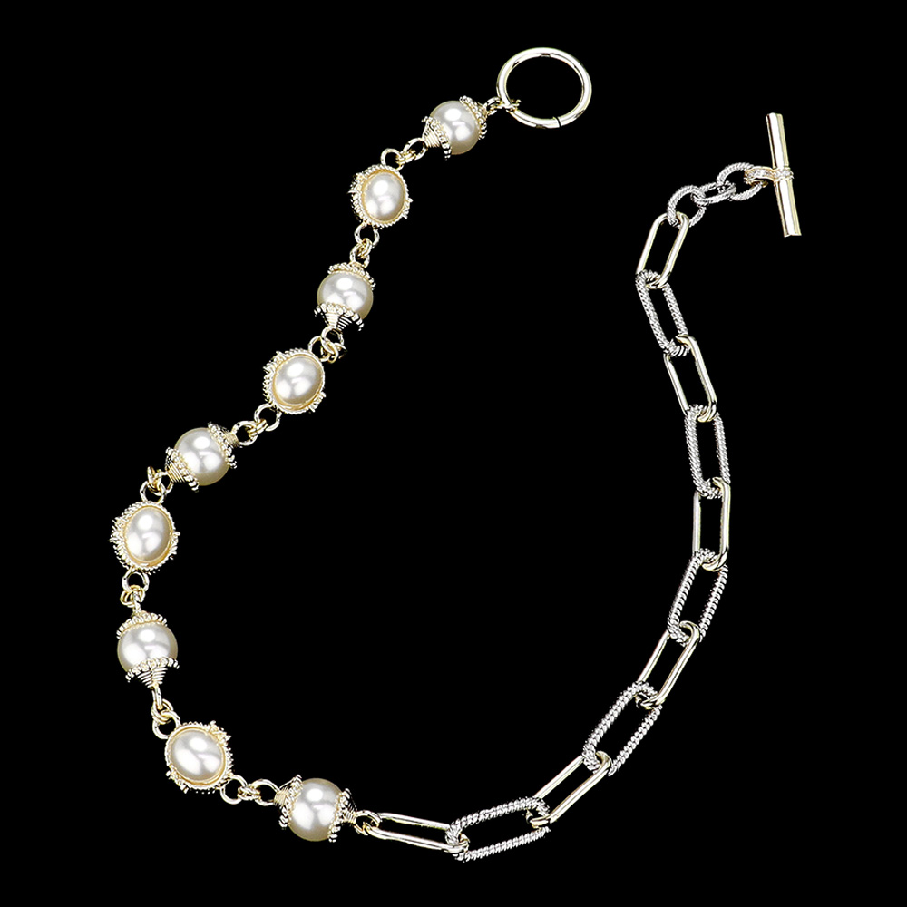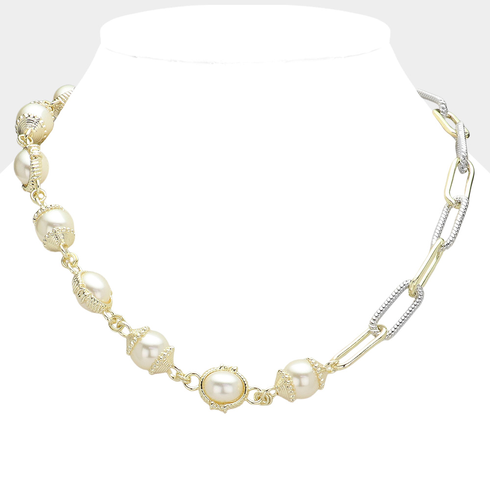 14K Gold Plated Pearl Pointed CZ Stone Paved Paperclip Chain Link Toggle Necklace