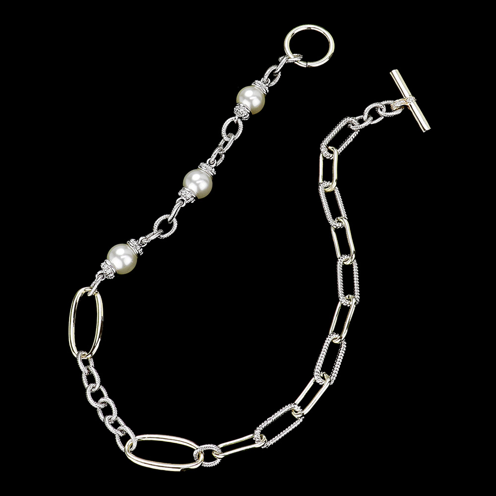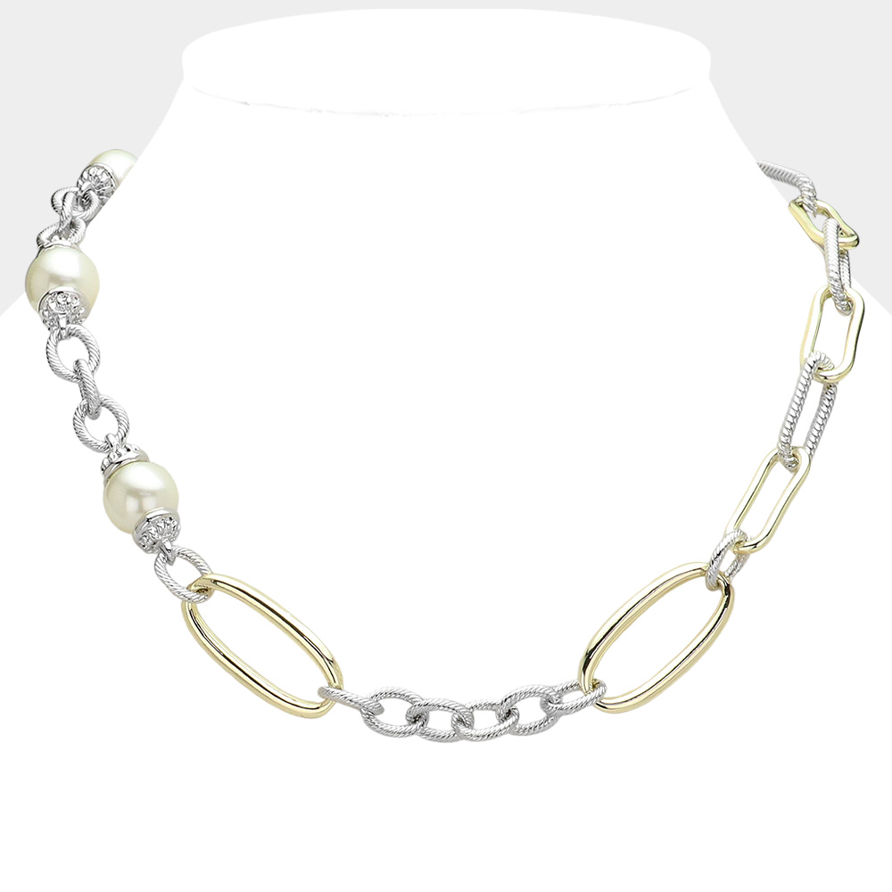 14K Gold Plated Pearl Pointed CZ Stone Paved Two Tone Paperclip Chain Link Toggle Necklace