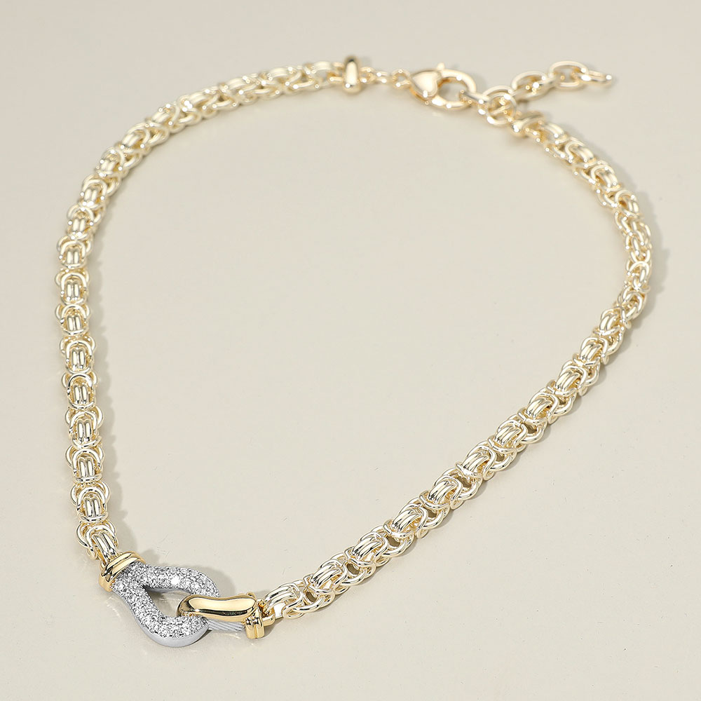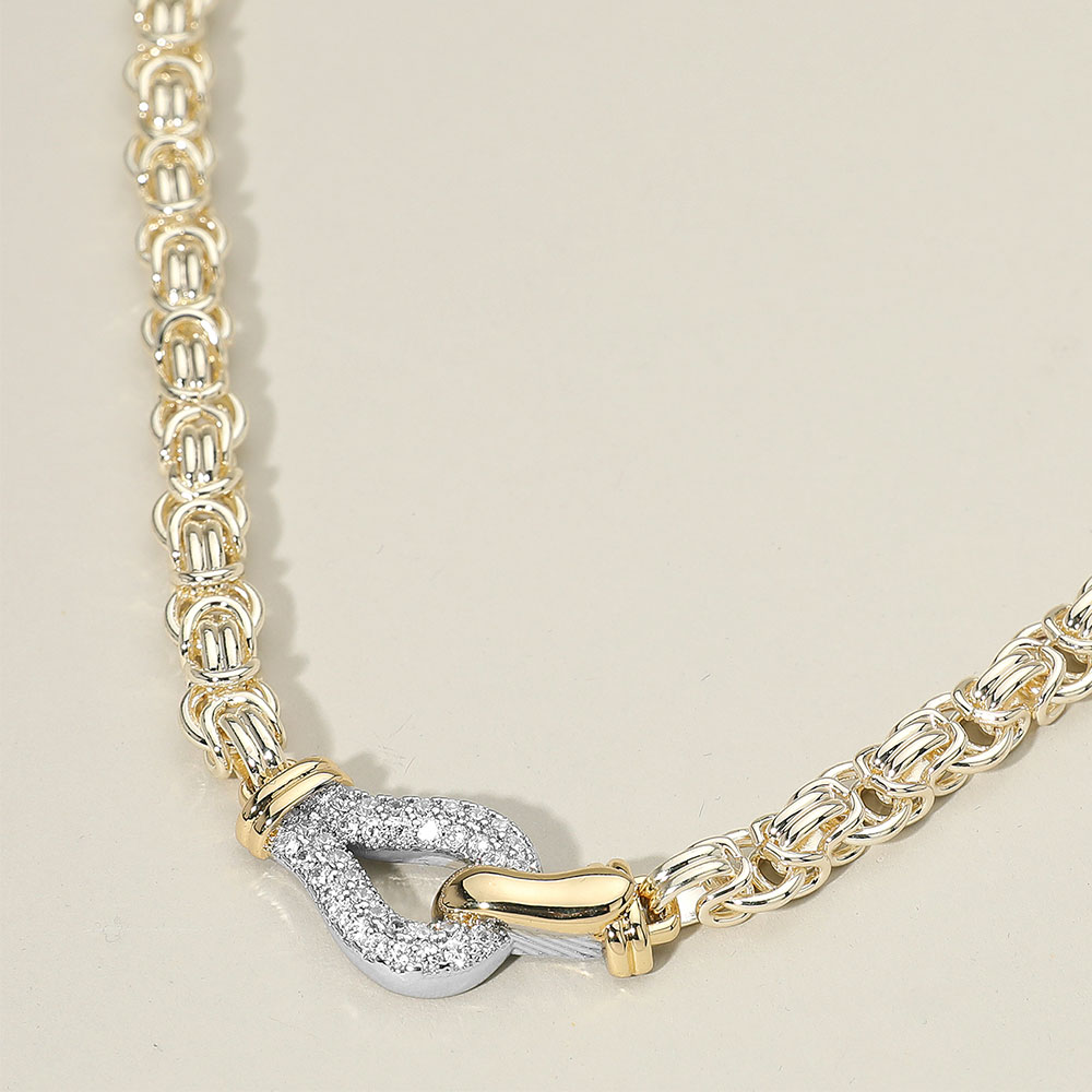 Details • Necklace Size : 18" + 2" L • Decor Size : 0.7" L • Refined and radiant, this textured chain necklace features a sleek crystal loop centerpiece that adds a hint of glamour. Its intricate woven links create depth and sophistication, making it an ideal statement accessory for both casual elegance and evening wear. • CZ Cubic Zirconia • Gold Dipped