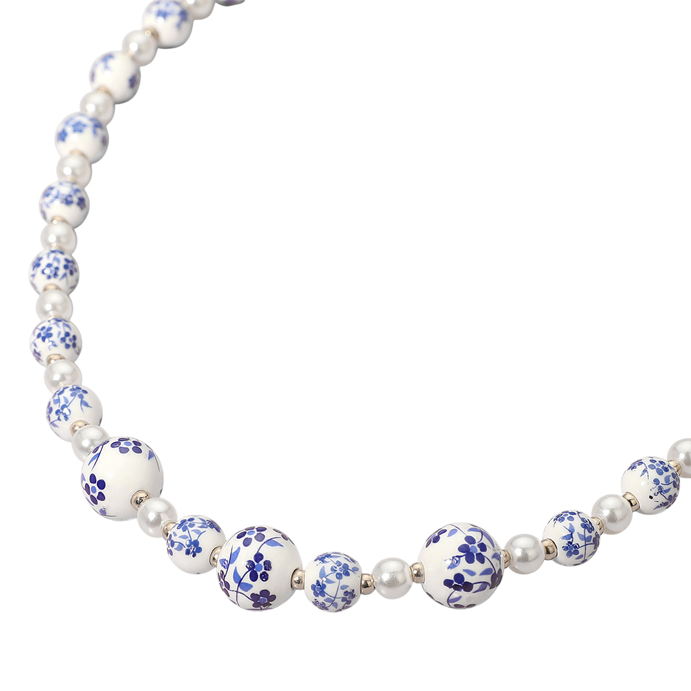 Details • Necklace Size : 18" + 3.25" L • Decor Size : 0.3" L • Elegant floral beaded necklace featuring round beads with delicate patterns, offering a unique blend of charm and sophistication. Perfect for everyday wear, special events, or gifting, this stylish accessory adds a touch of artistry and timeless beauty to both casual and dressy outfits. • Lead and Nickel Compliant