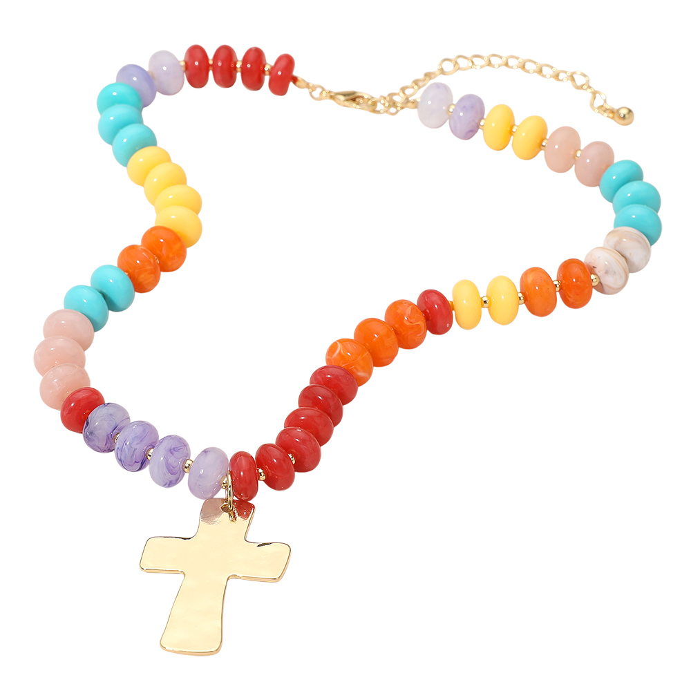 Details • Necklace Size : 18" + 3" L • Decor Size : 0.4" L • Pendant Size : 1.25" X 1.75" • Express timeless style with this beaded necklace featuring smooth multitone beads and a bold cross pendant. Ideal for layering or wearing as a statement piece, it’s perfect for both casual and special occasions, adding meaning and elegance to any look. • Gold Dipped • Lead and Nickel Compliant