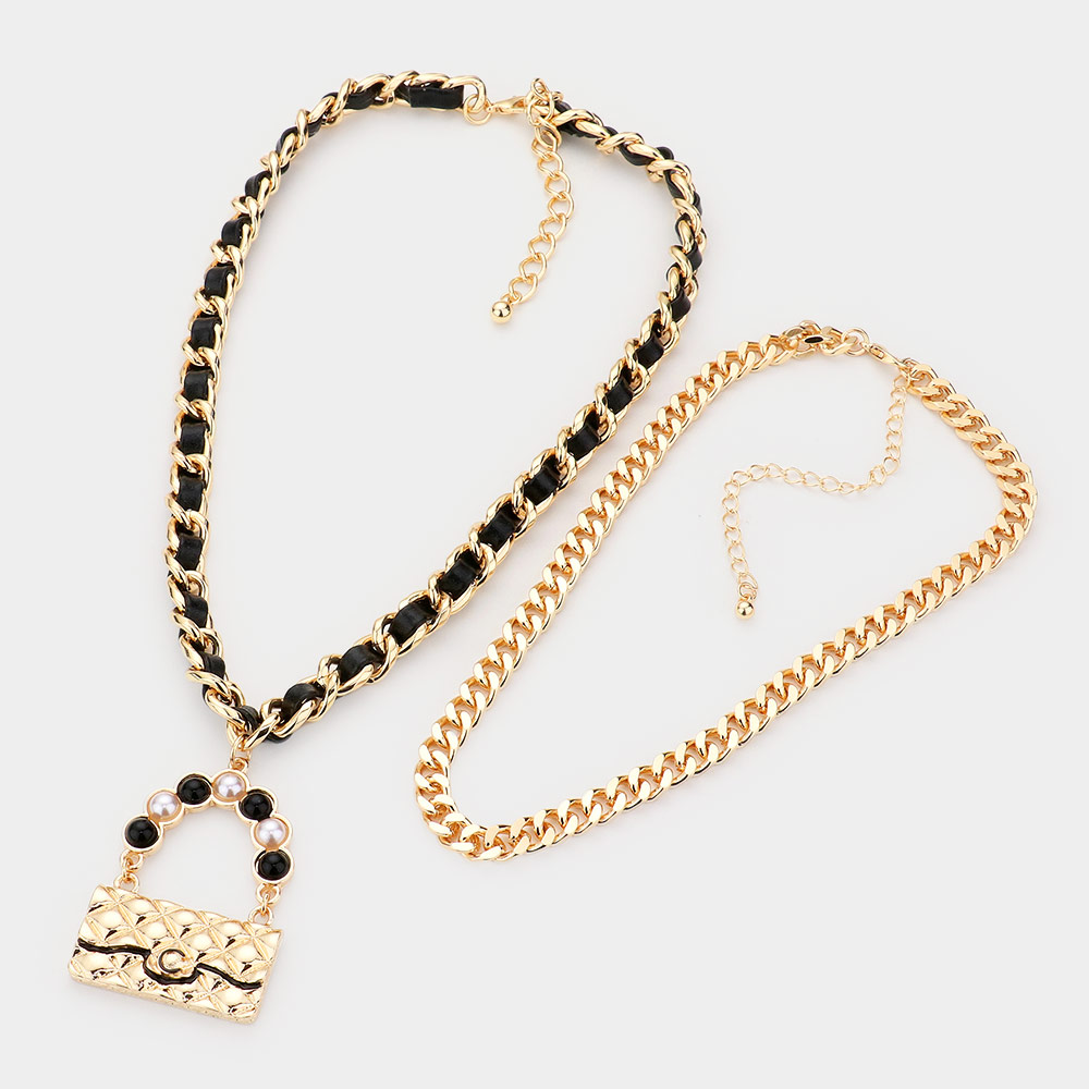 2PCS - Metal Chain Pearl Embellished Bag Pendant Necklaces