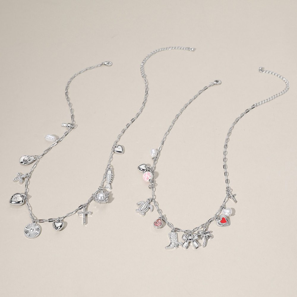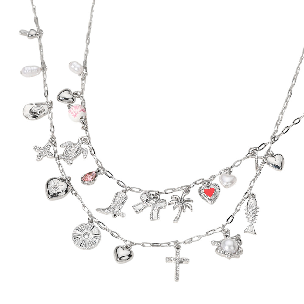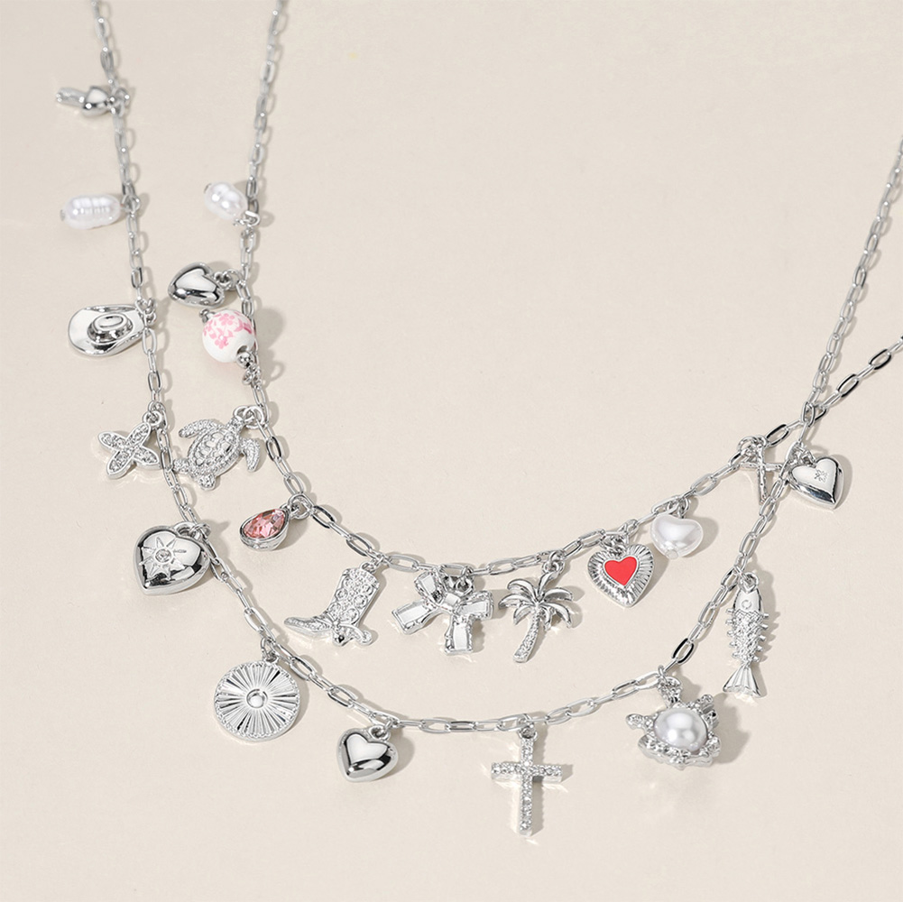 Details • Necklace 1 Size : 15.5" + 3.25" L, 0.75" L • Necklace 2 Size : 17" + 3" L, 0.75" L • Elegant layered necklace adorned with a variety of playful charm pendants, including hearts, crosses, and nature-inspired motifs. A stylish accessory that blends boho flair with everyday sophistication for a unique, eye-catching look. • Lead and Nickel Compliant