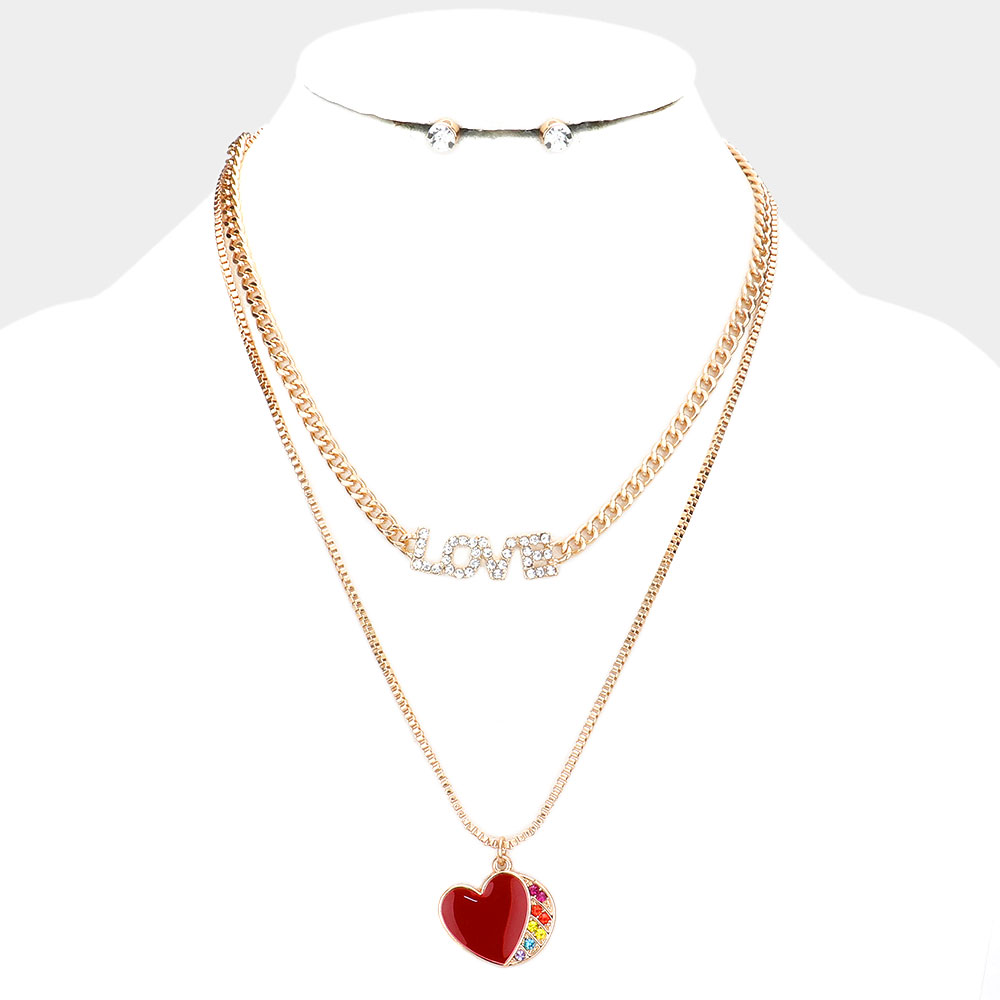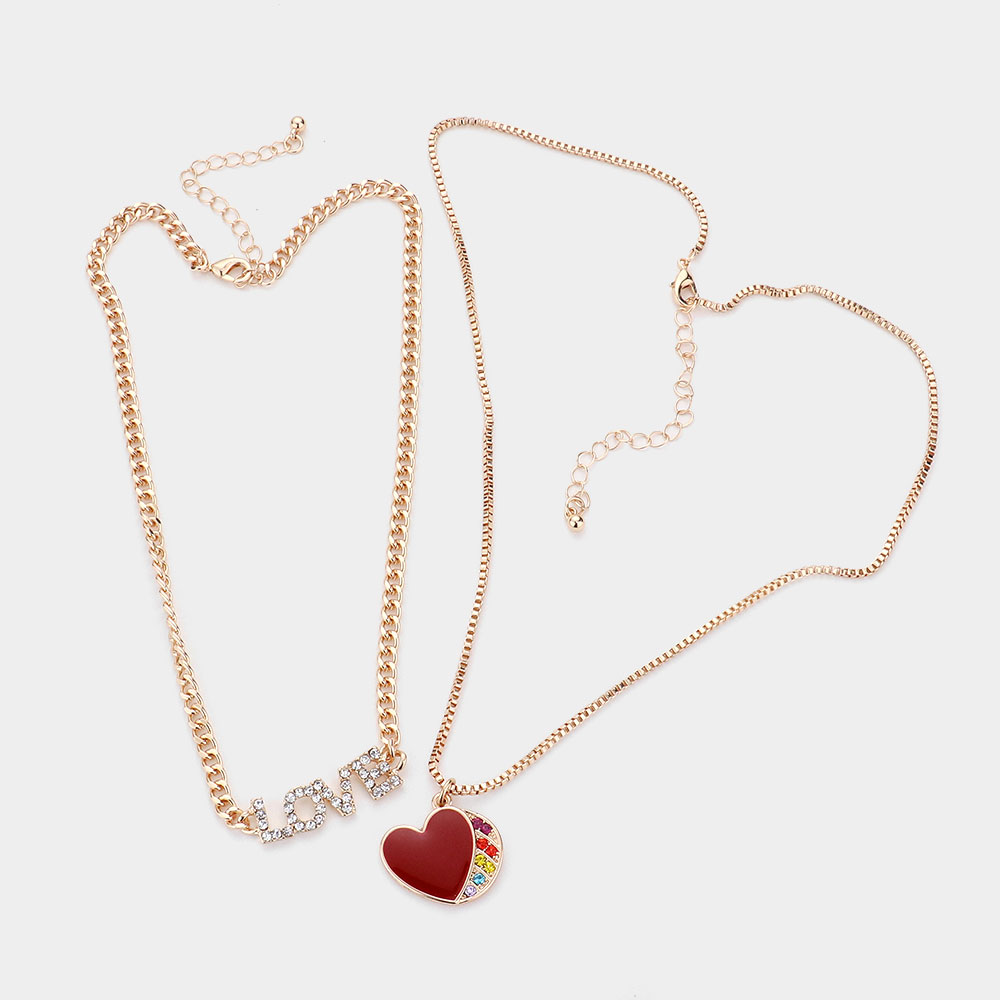 2PCS - Rhinestone Embellished Metal LOVE Message Enamel Heart Pendant Necklaces