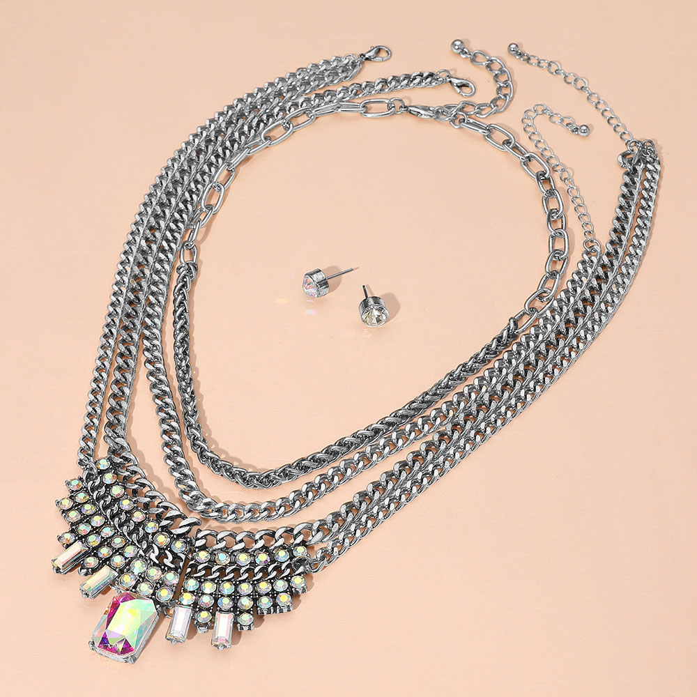 Details • Necklace 1 Size : 17" + 2.5" L, 0.25" L • Necklace 2 Size : 19" + 3.25" L, 1.75" L • Necklace 3 Size : 16.5" + 3.5" L, 0.25" L • Earrings Size : 0.3" L • Elevate your outfit with this striking multi-layer necklace featuring shimmering crystal details and matching studs. A bold, elegant accessory set perfect for special occasions or standout style moments. • Lead and Nickel Compliant