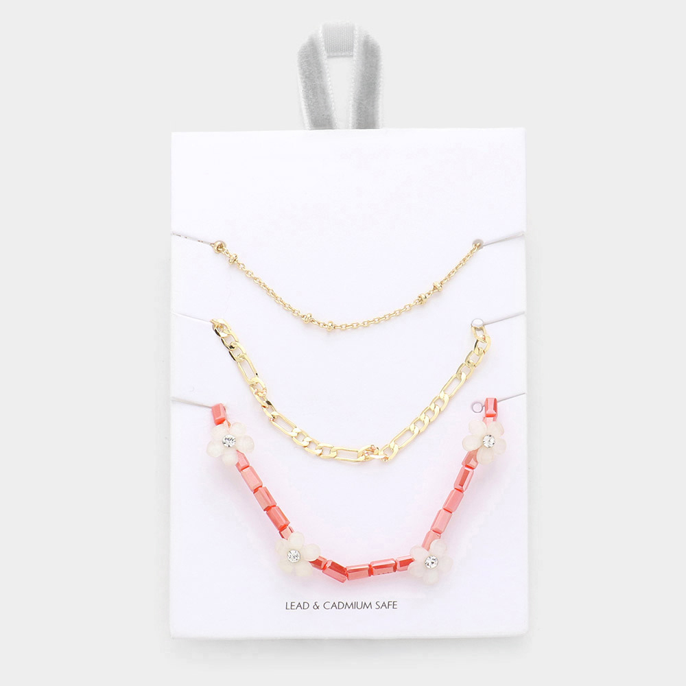 3PCS - Metal Chain Flower Accented Beaded Necklaces