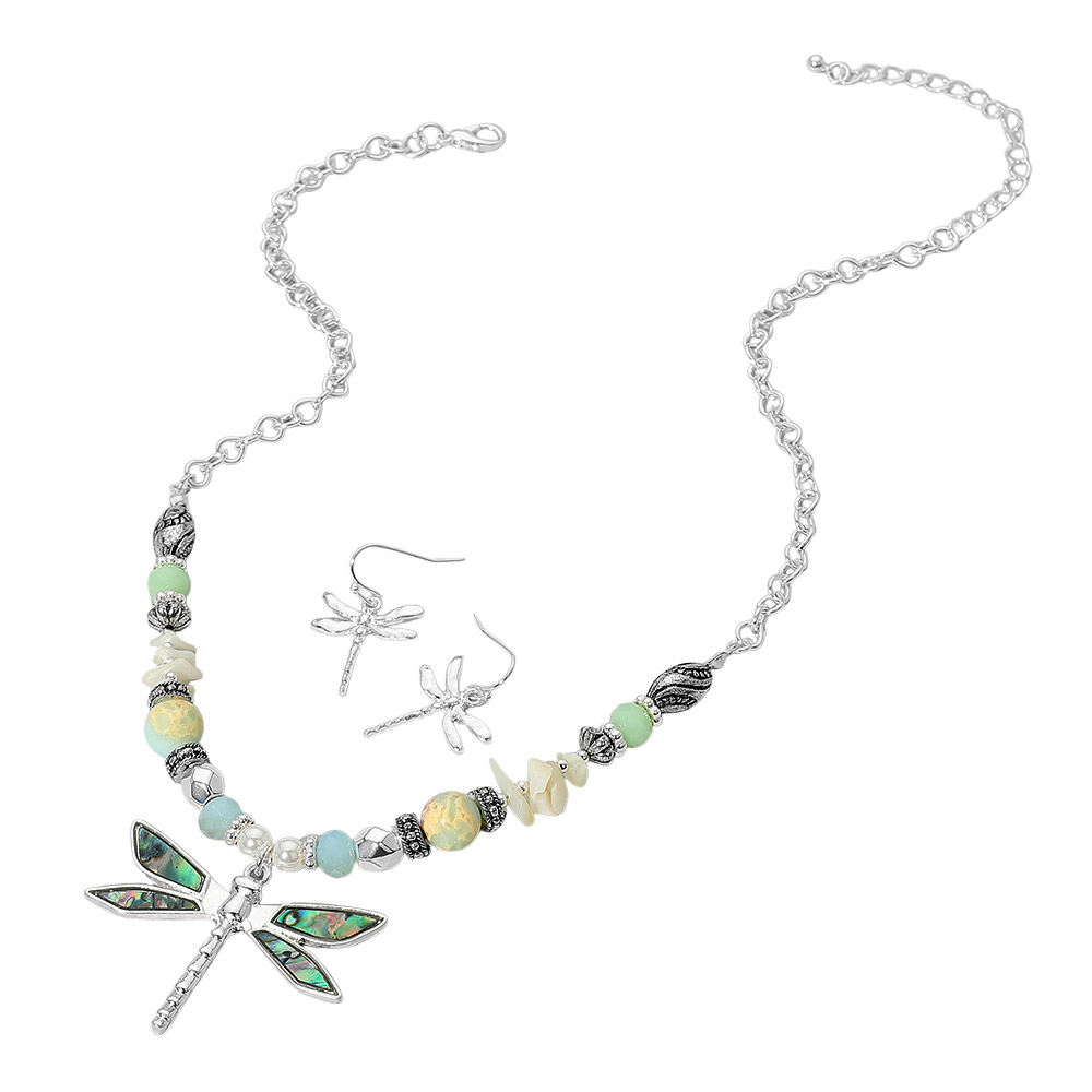 • Elegant jewelry set featuring a dragonfly pendant necklace with matching earrings and a mix of decorative beads. Perfect for adding a whimsical, nature-inspired accent to any outfit or occasion.
