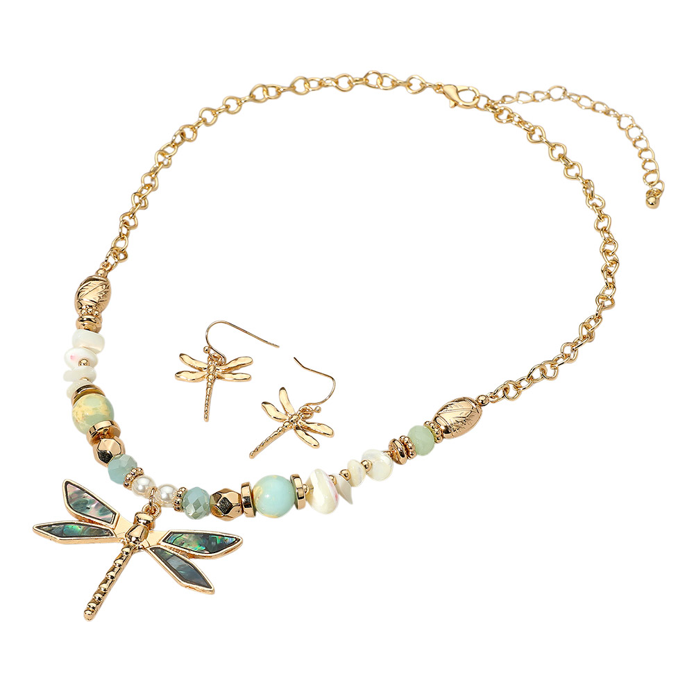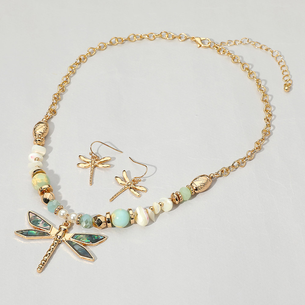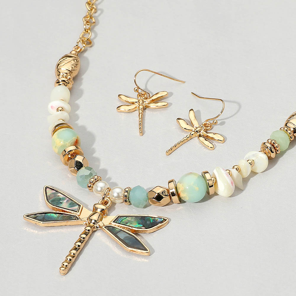 Details • Necklace Size : 18" + 3" L • Decor Size : 0.3" L • Pendant Size : 1.8" X 1.4" • Earrings Size : 1.25" L • Elegant jewelry set featuring a dragonfly pendant necklace with matching earrings and a mix of decorative beads. Perfect for adding a whimsical, nature-inspired accent to any outfit or occasion. • Lead and Nickel Compliant