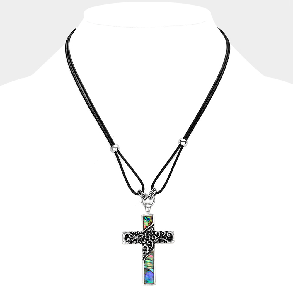 Abalone Embossed Antique Metal Cross Pendant Necklace