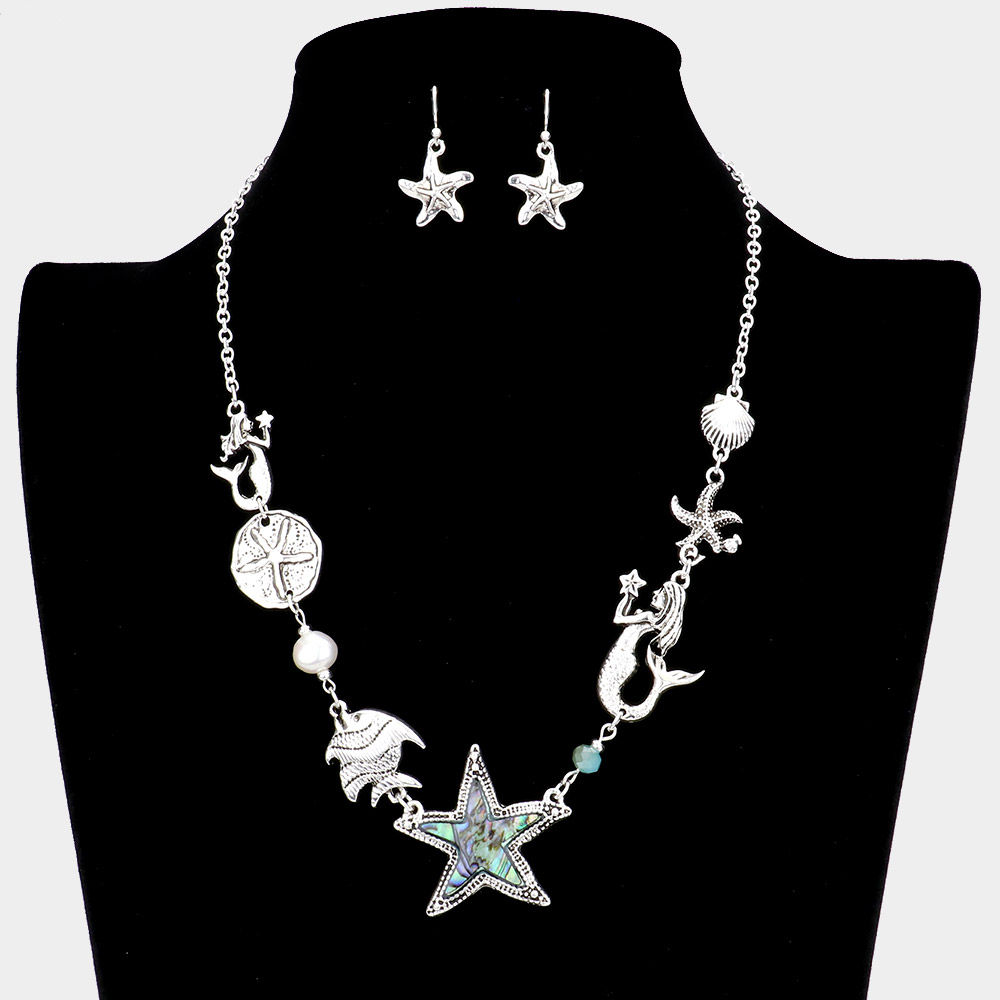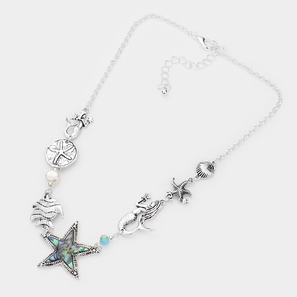 Abalone Starfish Metal Mermaid Sand Dollar Shell Freshwater Pearl Link Necklace