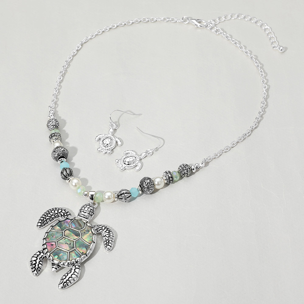 Details • Necklace Size : 17" + 3" L • Decor Size : 0.3" L • Pendant Size : 1.8" X 2.6" • Earrings Size : 1.25" L • Charming jewelry set featuring a turtle pendant necklace and matching earrings with decorative beads. A fun, beachy accessory ideal for casual wear or adding a playful touch to your everyday style. • Lead and Nickel Compliant