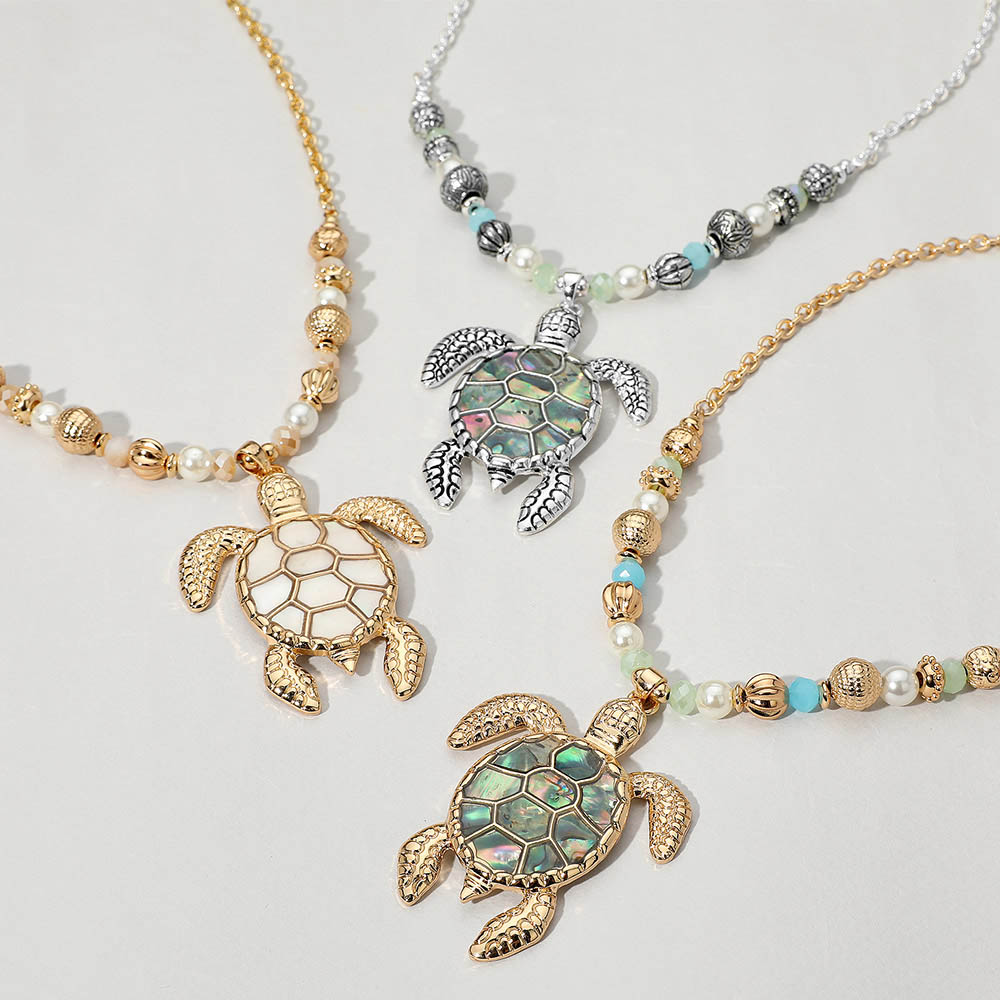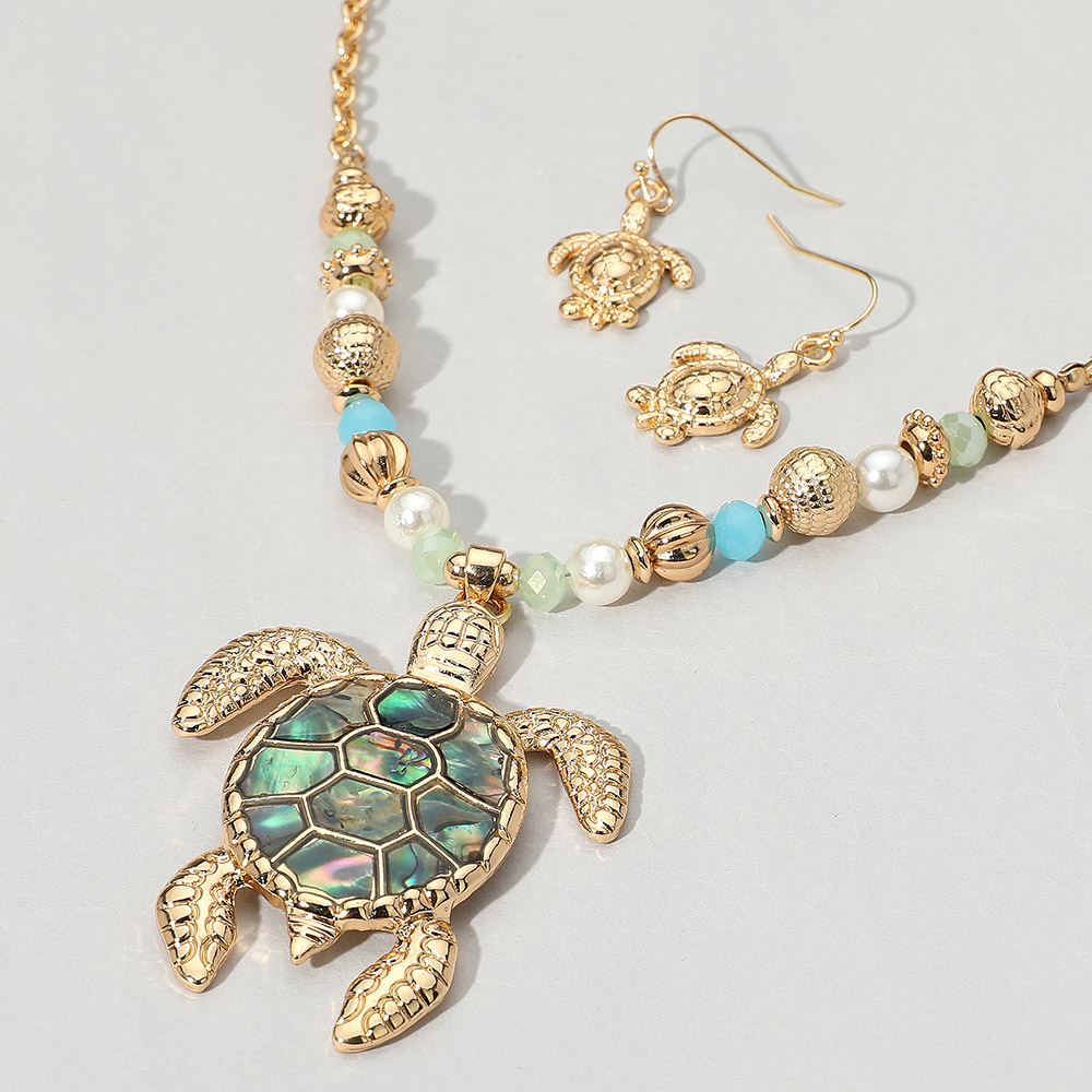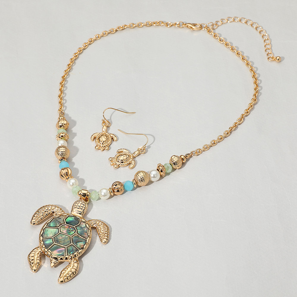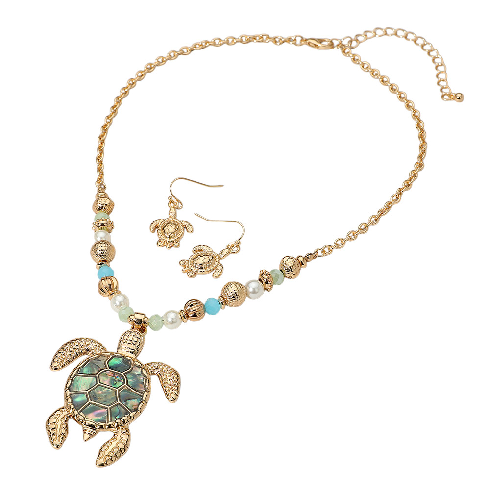 Details • Necklace Size : 17" + 3" L • Decor Size : 0.3" L • Pendant Size : 1.8" X 2.6" • Earrings Size : 1.25" L • Charming jewelry set featuring a turtle pendant necklace and matching earrings with decorative beads. A fun, beachy accessory ideal for casual wear or adding a playful touch to your everyday style. • Lead and Nickel Compliant