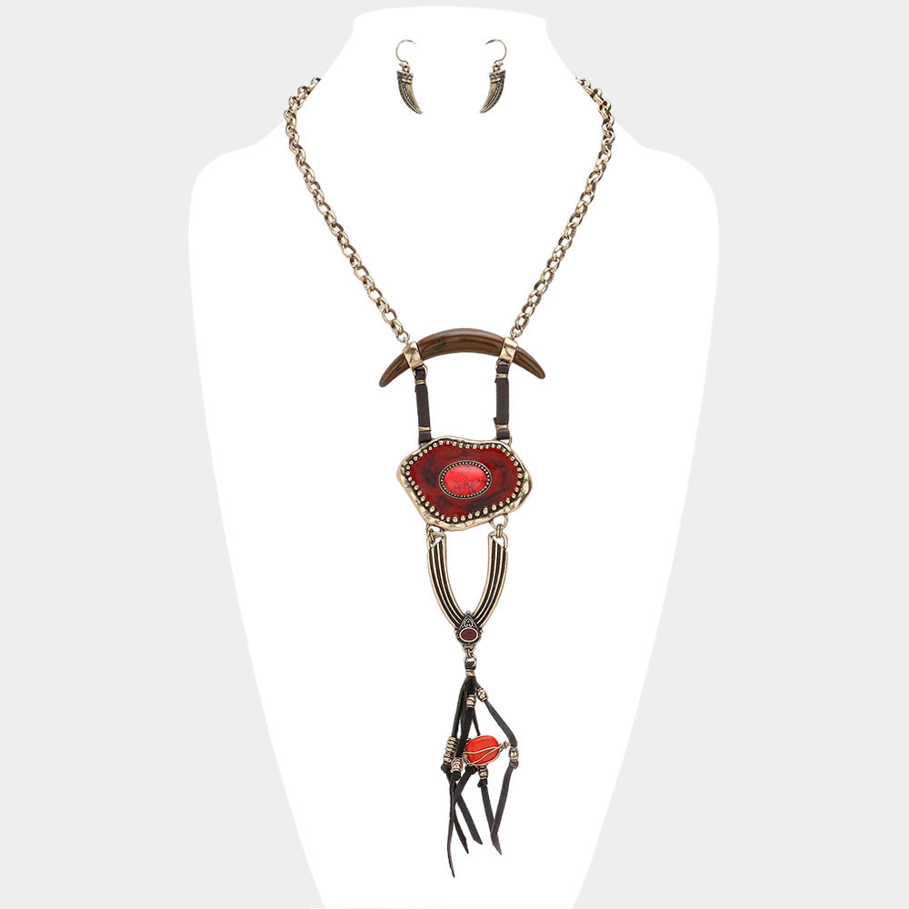 Abstract Double Horn & Faux Leather Tassel Necklace