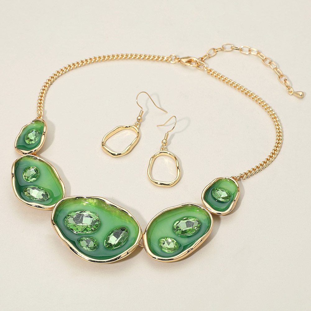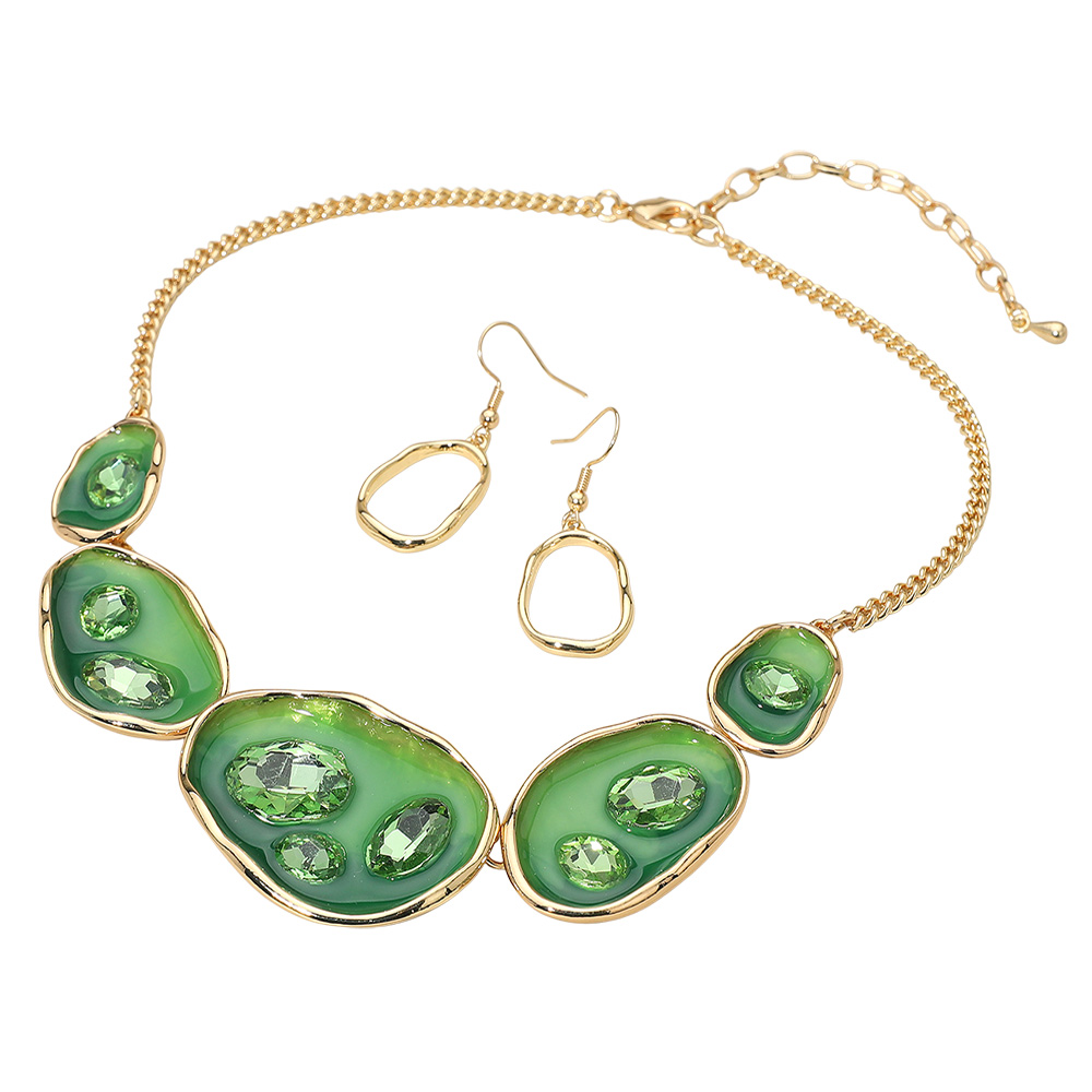 Details • Necklace Size : 16" + 3.25" L • Decor Size : 1.3" L • Earrings Size : 1.6" L • Contemporary jewelry set featuring a bold necklace and matching earrings with artistic gem accents framed in fluid shapes. Perfect for parties, formal events, or chic everyday wear. A statement-making accessory that combines modern style with elegant sophistication. • Lead and Nickel Compliant