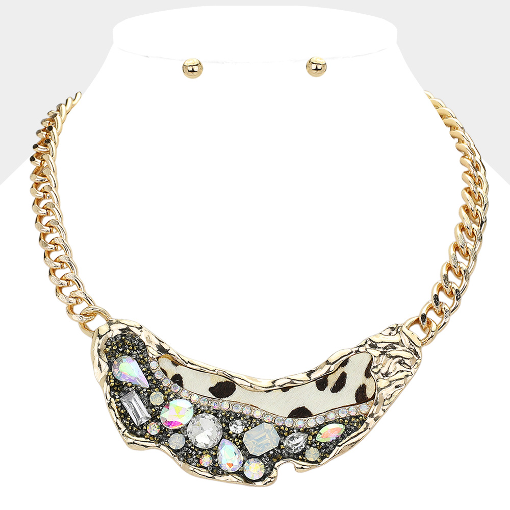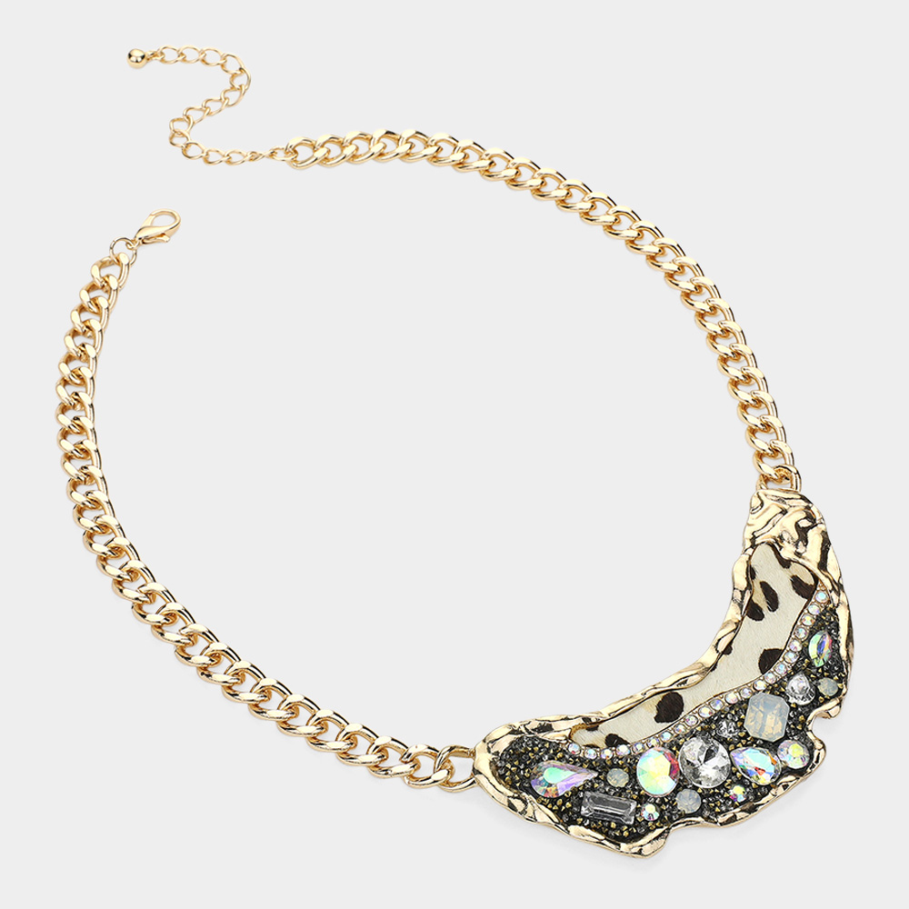 Animal Printed Fur Sparkly Stone Embellished Bib Necklace