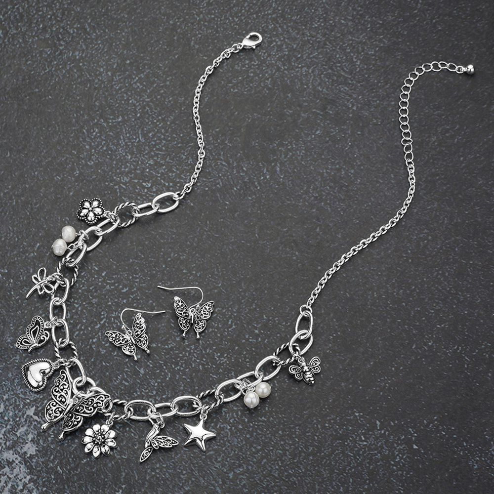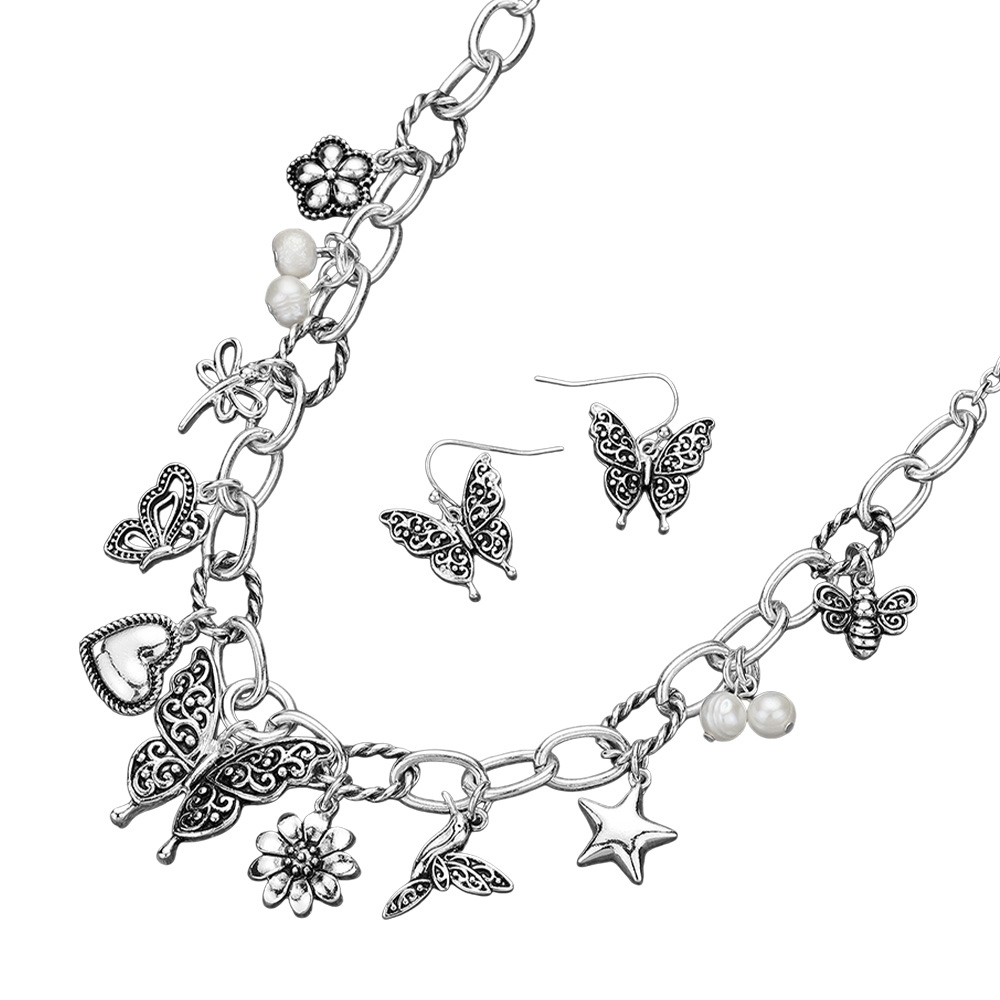 Antique Metal Butterfly Dragonfly Heart Flower Bird Star Honey Bee Pearl Charm Station Necklace