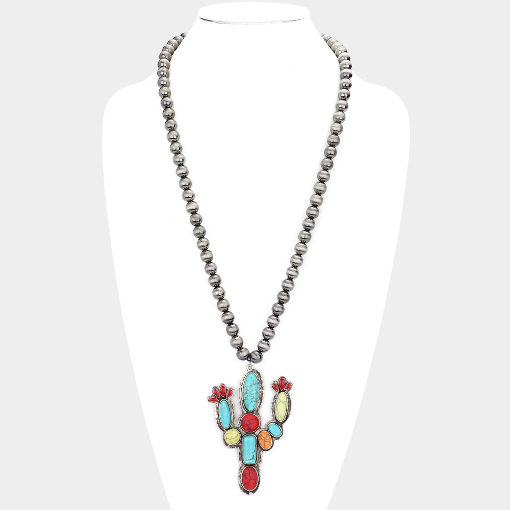 Antique Metal Natural Stone Cactus Pendant Necklace