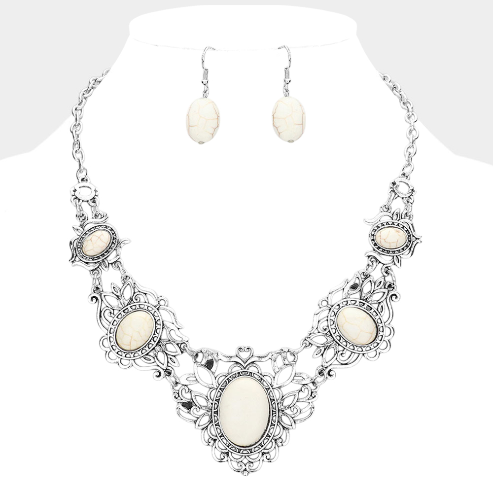 Stone Embellished Open Circle Oval Natural Stone Pendant Necklace