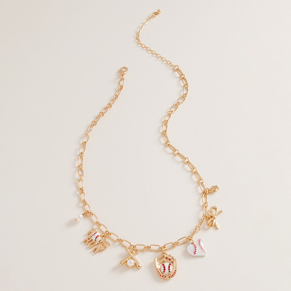 Details • Necklace Size : 16" + 3" L • Decor Size : 1" L • Chic necklace featuring baseball-themed charms including bats, glove, and heart. A playful accessory for sports fans or casual looks. Adds a fun and sporty touch to everyday outfits or gift sets. • Lead and Nickel Compliant