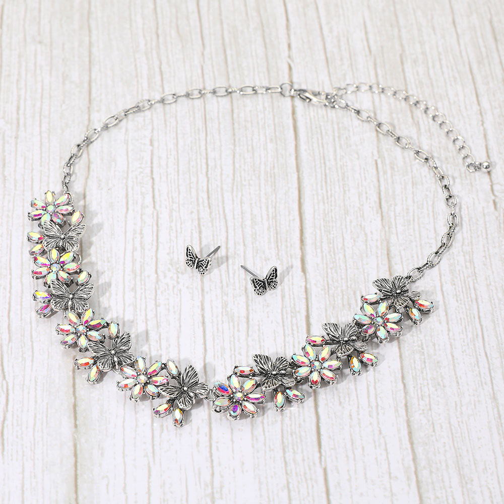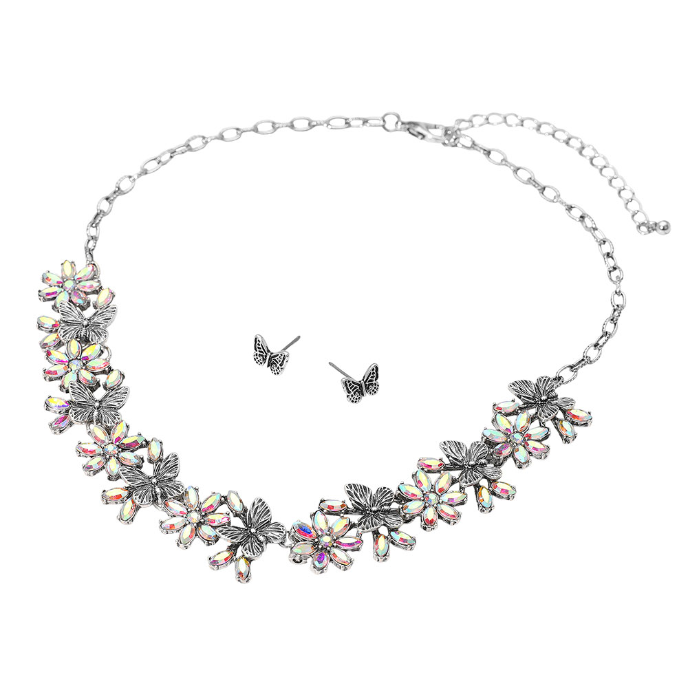 Details • Necklace Size : 17" + 3" L • Decor Size : 0.8" L • Earrings Size : 0.3" L • Add a whimsical touch to your look with this floral butterfly necklace and earring set, featuring radiant stones that shimmer with iridescent brilliance. The delicate flower and butterfly motifs create a graceful, nature-inspired design perfect for enhancing any outfit with sparkle and charm. • Lead and Nickel Compliant