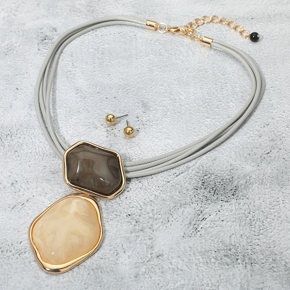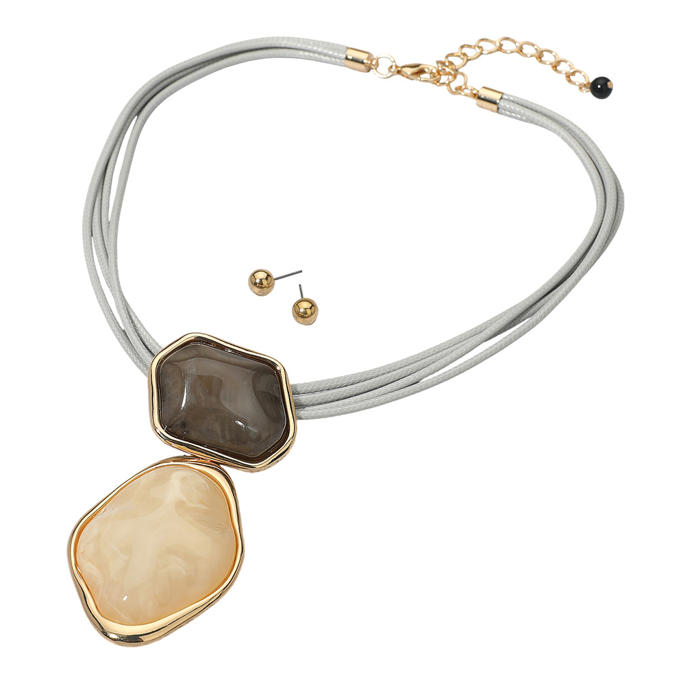Details • Necklace Size : 19" + 4" L • Decor Size : 3.75" L • Earrings Size : 0.25" L • Bold pendant necklace paired with coordinating stud earrings for a complete look. The unique layered design adds eye-catching detail, making this set perfect for elevating casual outfits or complementing evening attire with effortless elegance. • Lead and Nickel Compliant