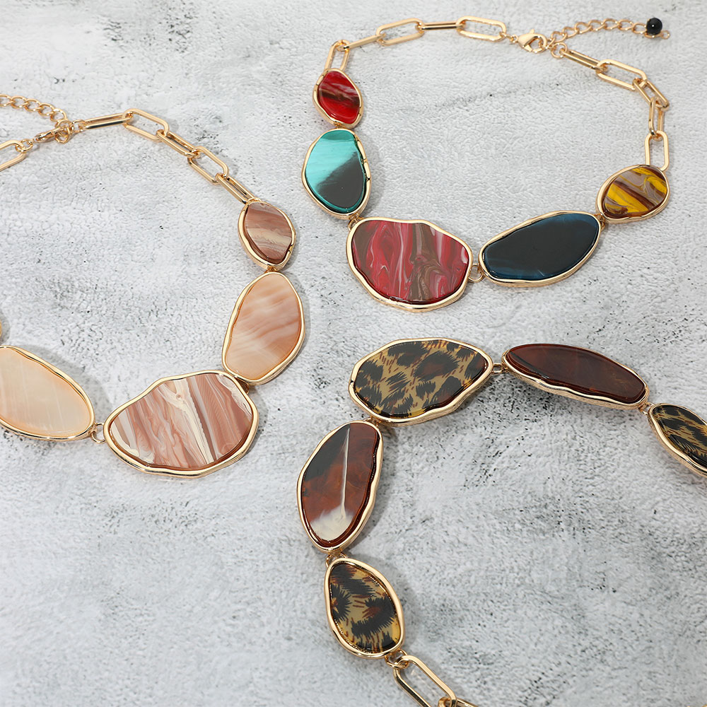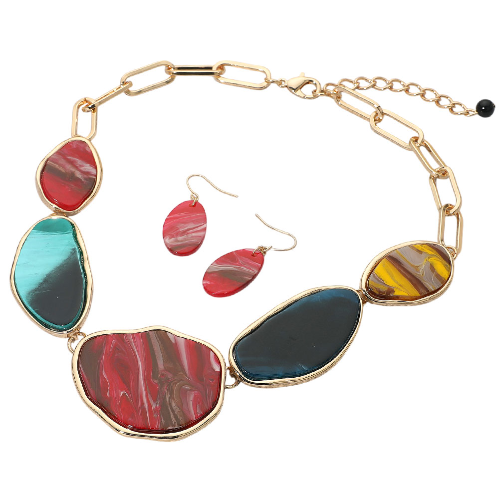 • Striking jewelry set featuring a statement necklace with irregular stone-shaped accents and matching earrings. Designed to add vibrant flair to your outfit, this set blends bold style with elegant detailing for a show-stopping look.