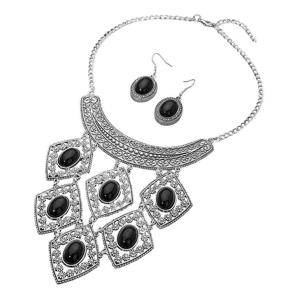 • Make a bold entrance with this vintage-inspired necklace and matching earrings set featuring intricate metalwork and striking oval accents. Its ornate layered design adds dramatic flair to evening looks, special occasions, and standout outfits, delivering unmistakable statement style.