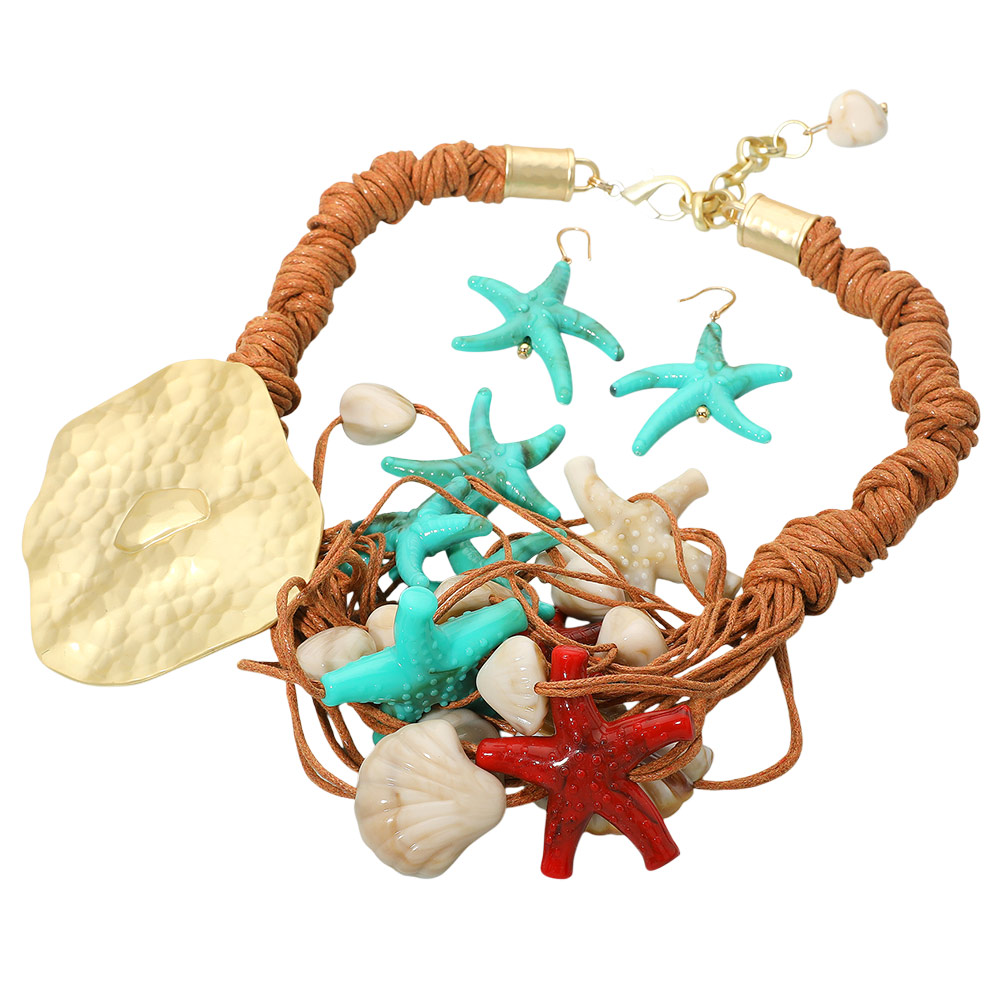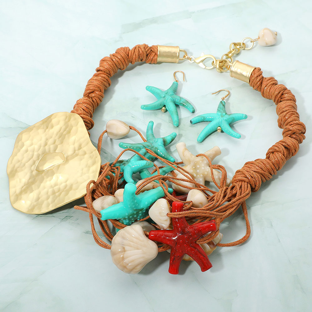 • Vibrant statement necklace adorned with starfish, shells, and textured details, paired with matching earrings. A unique beach-inspired accessory set perfect for summer events or resort style looks.