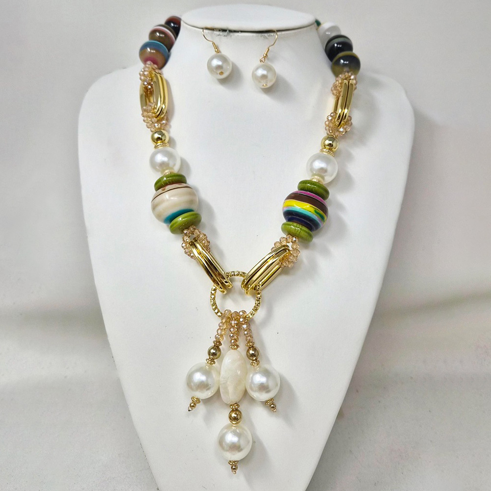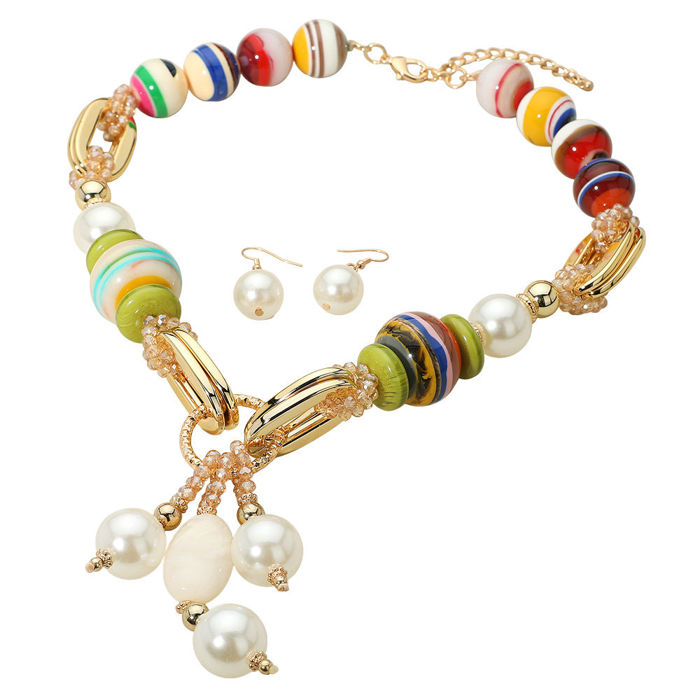 Details • Necklace Size : 21" + 3.75" L • Decor Size : 4.25" L • Earrings Size : 1.6" L • Make a striking impression with this bold beaded statement necklace set featuring vibrant round beads, pearl accents, and gold-tone detailing. Complete with matching earrings, this eye-catching set is perfect for elevating evening wear or adding flair to casual outfits. • Lead and Nickel Compliant