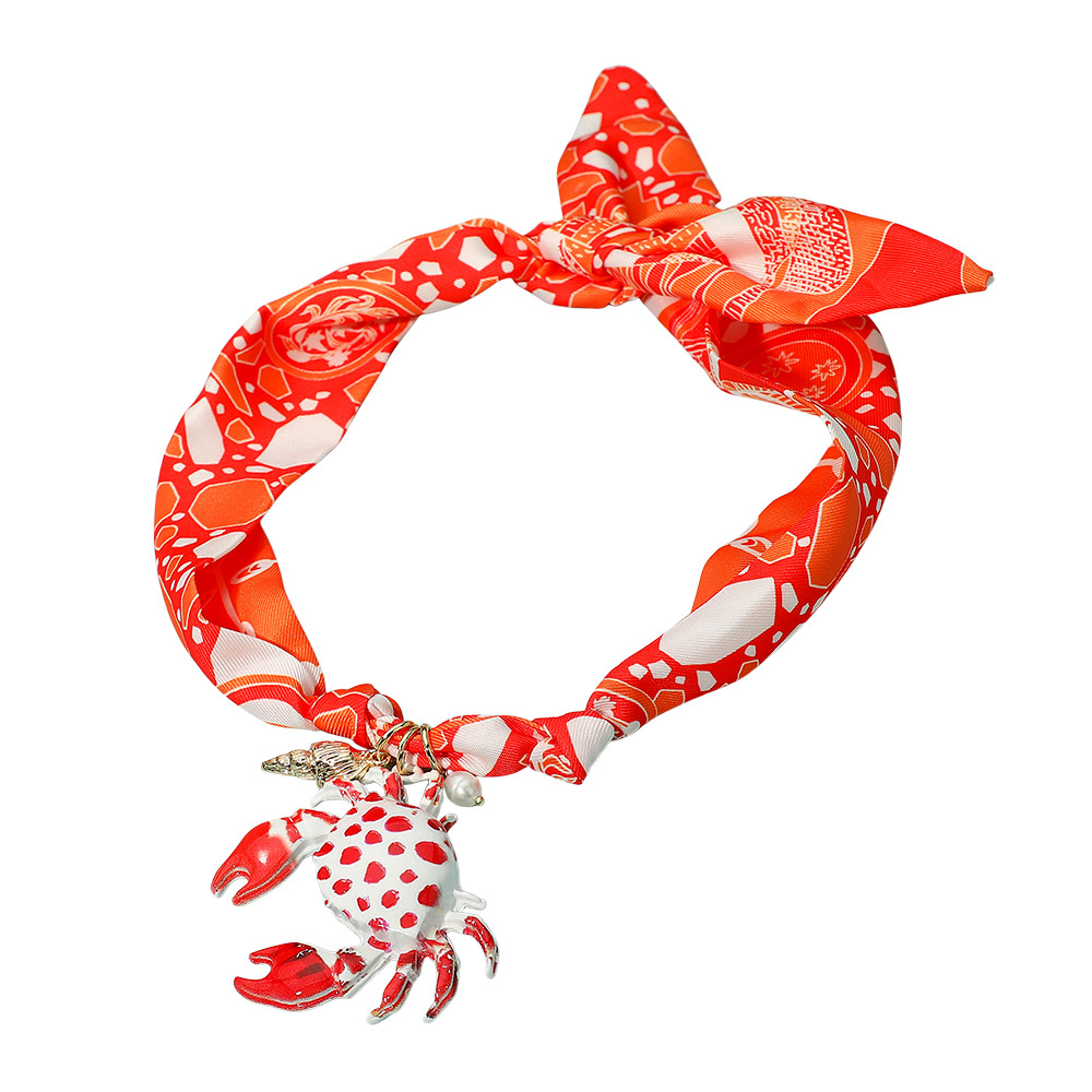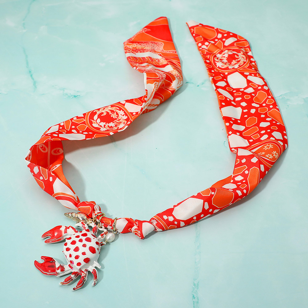 Details • Necklace Size : 31" L / Adjustable • Pendant Size : 2.25" X 2.8" • Print May Vary • Playful scarf necklace featuring a patterned fabric tie with a bold crab pendant, seashell accent, and pearl detail. Adjustable and eye-catching, this fun accessory adds a coastal-inspired statement to any casual or vacation outfit. • Lead and Nickel Compliant