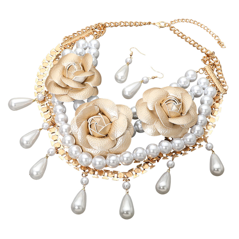 Bold Faux Leather Floral Embellished Pearl Strand Statement Necklace