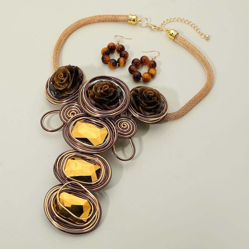 • This bold statement necklace and earring set showcases an artistic blend of floral motifs and faceted gem accents. Designed to stand out, it adds dramatic elegance and creative flair to any outfit, making it the perfect accessory for special events or evening glamour.