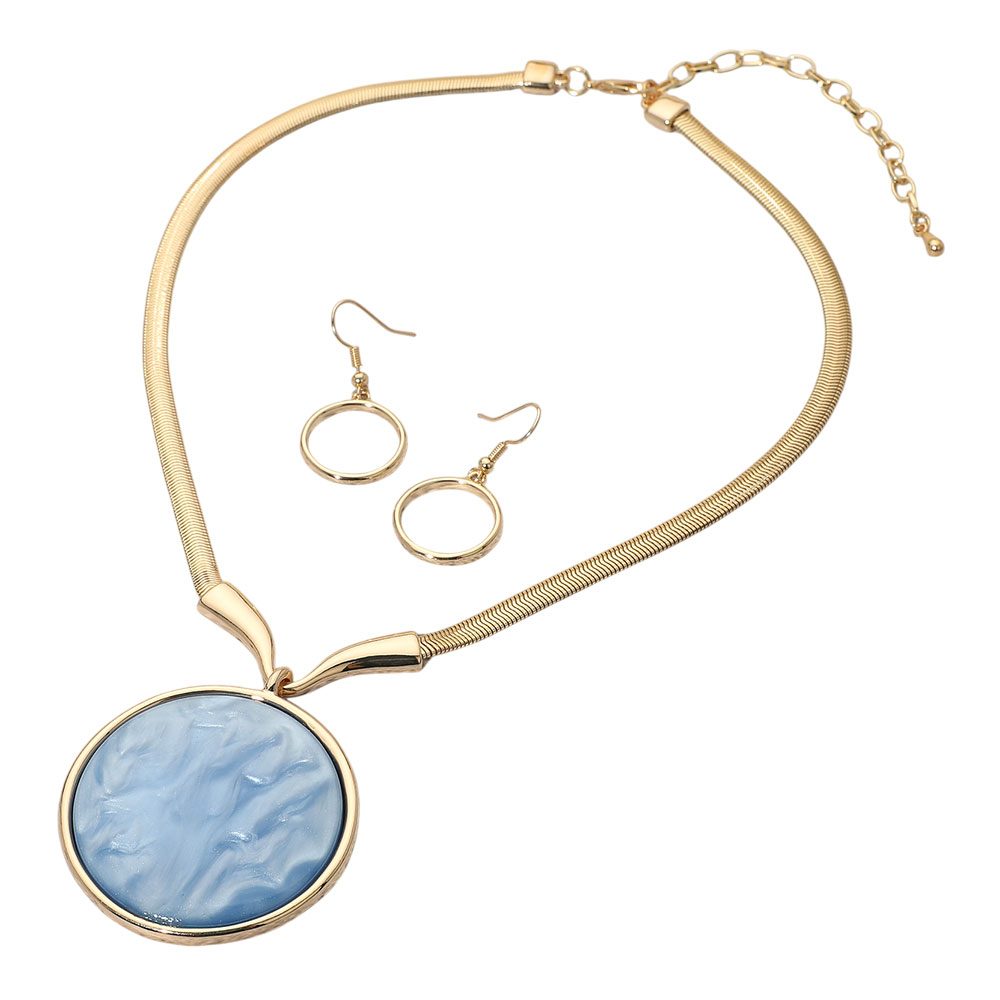 Details • Necklace Size : 17" + 3.75" L • Pendant Size : 1.8" X 2.1" • Earrings Size : 1.4" L • Elegant necklace and earring set featuring a bold round pendant with a marbled finish. Perfect for adding a sophisticated and modern accent to your everyday or special occasion outfits. • Lead and Nickel Compliant