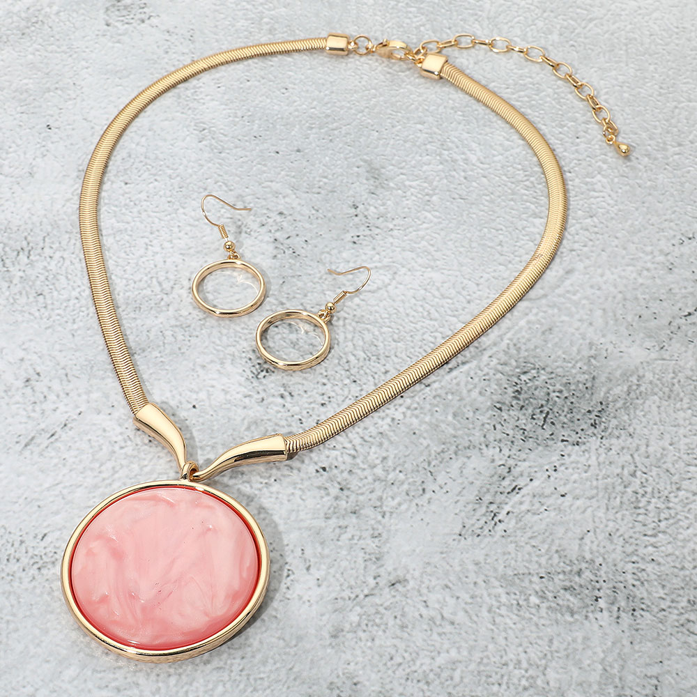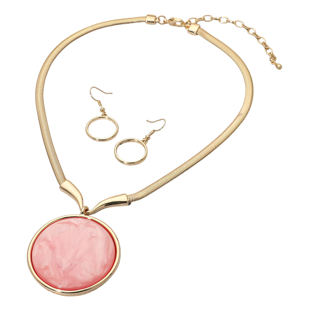 • Elegant necklace and earring set featuring a bold round pendant with a marbled finish. Perfect for adding a sophisticated and modern accent to your everyday or special occasion outfits.