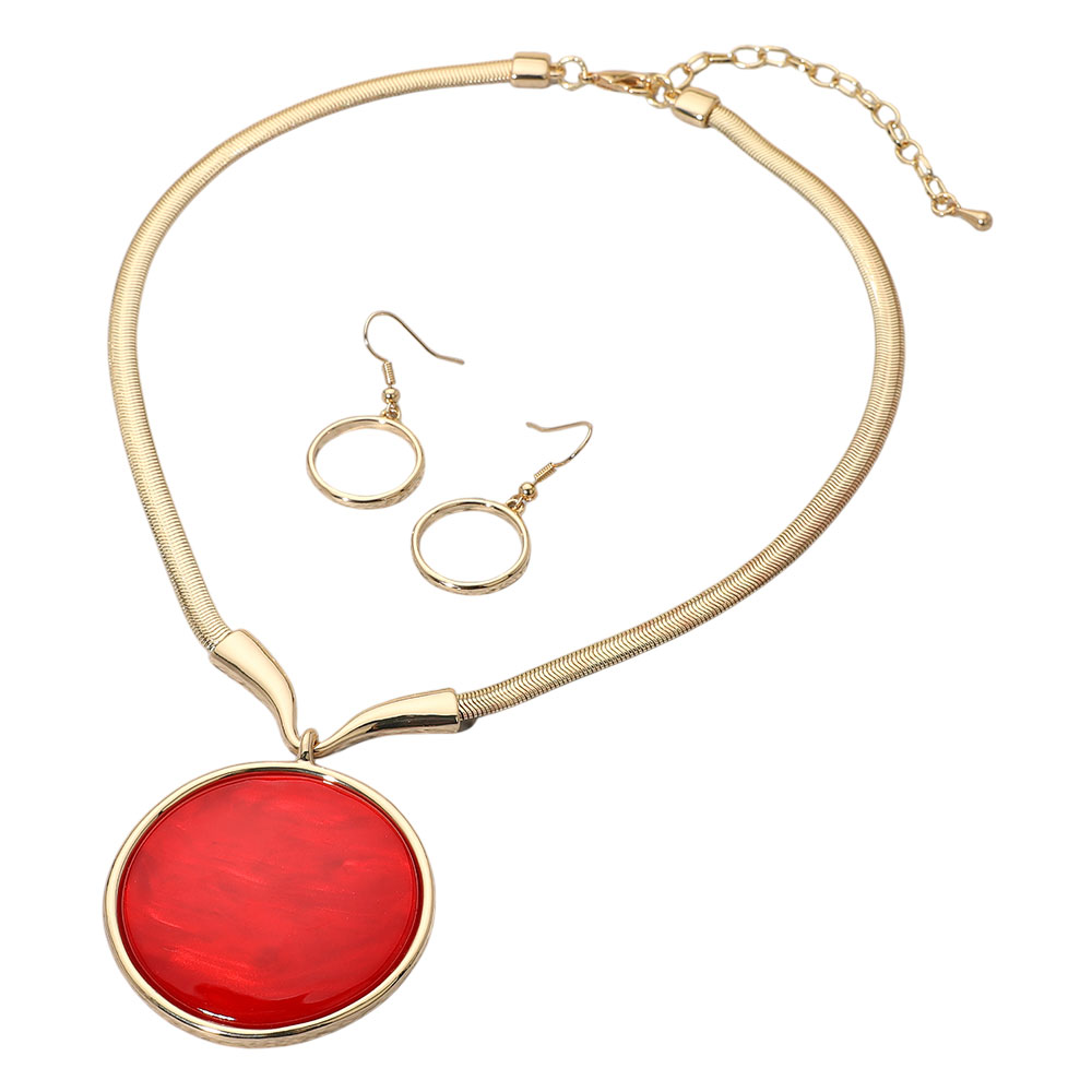 • Elegant necklace and earring set featuring a bold round pendant with a marbled finish. Perfect for adding a sophisticated and modern accent to your everyday or special occasion outfits.