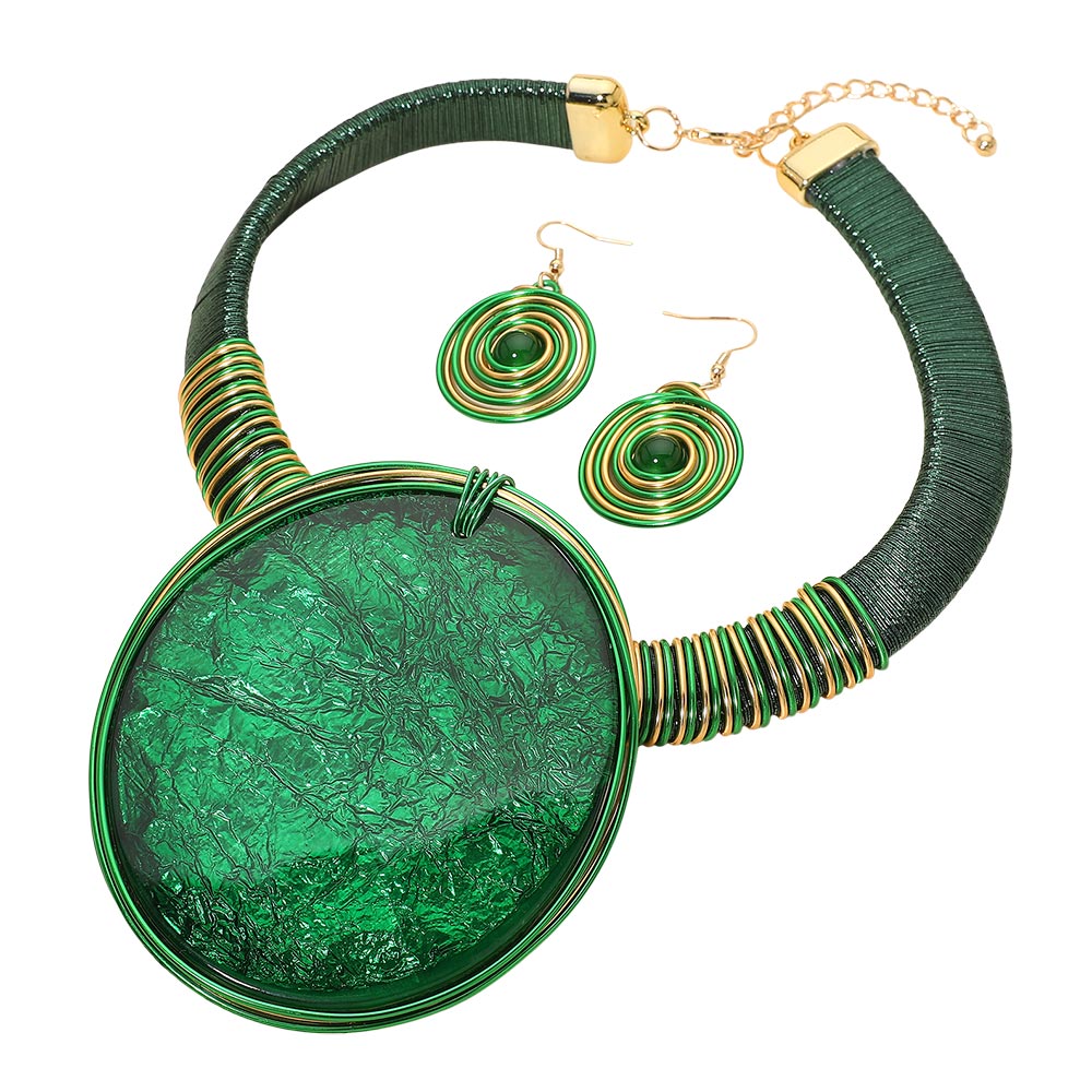 • This bold jewelry set features an oversized textured pendant paired with matching spiral earrings for a coordinated, artful look. Designed to stand out, it adds expressive style and sculptural detail to any outfit, making it ideal for special occasions or dramatic everyday wear.