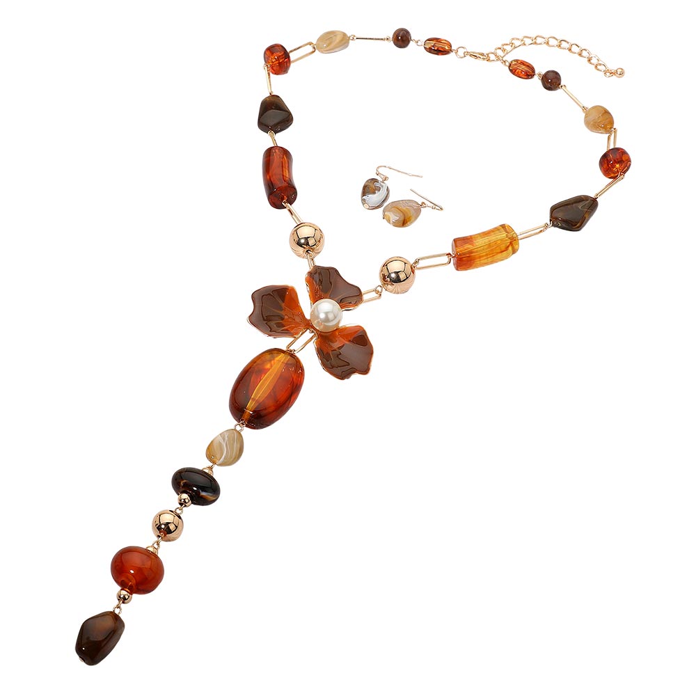 • Chic long necklace and earrings set featuring a sculpted floral pendant accented with faceted beads and metallic details. The elegant drop design and mixed shapes create a sophisticated statement piece ideal for dressing up both casual and formal outfits.