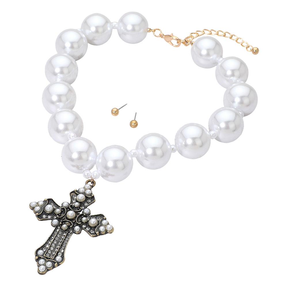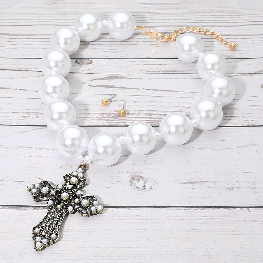Details • Necklace Size : 17" + 3.5" L • Pendant Size : 2.3" X 3" • Earrings Size : 0.2" L • Elegant beaded necklace featuring large round beads and a vintage-inspired cross pendant embellished with crystals and accents. Paired with coordinating stud earrings, this set offers a refined and timeless style for formal or statement looks. • Lead and Nickel Compliant