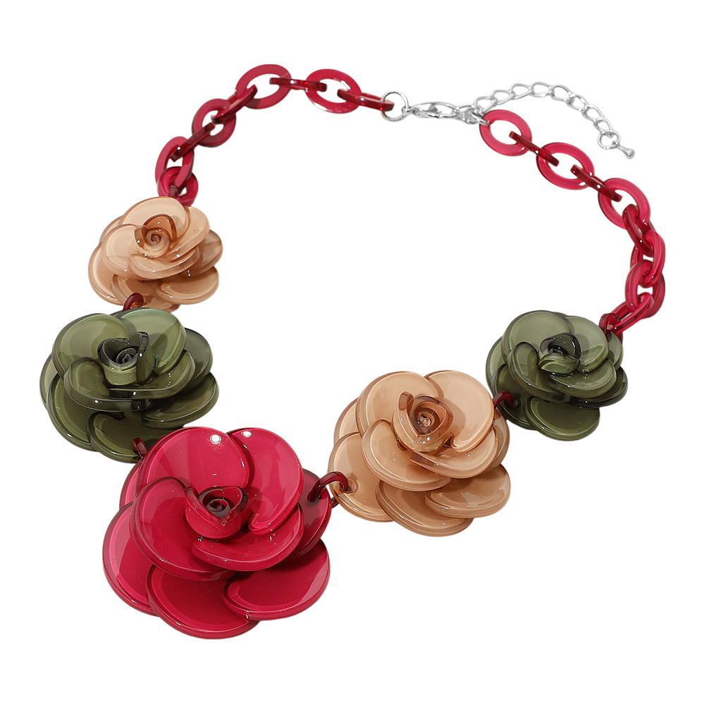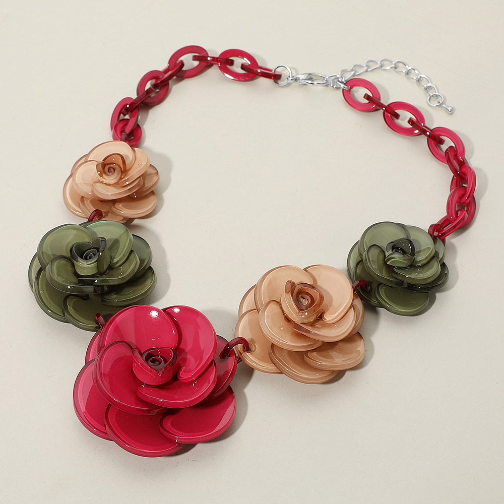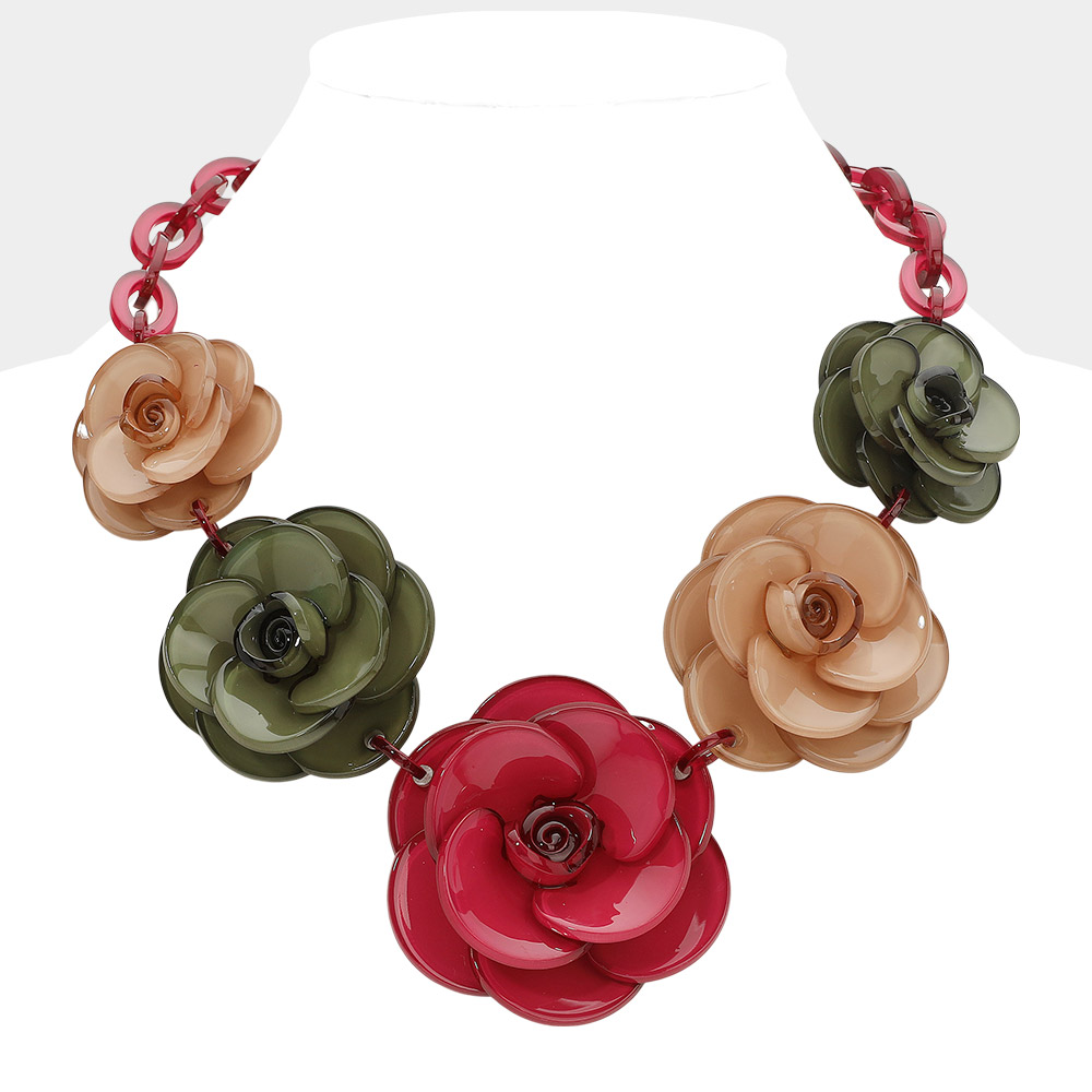 Details • Necklace Size : 18" + 3" L • Decor Size : 2.25" L • Make a dramatic entrance with this statement necklace featuring oversized layered rose accents and a chunky chain link. Perfect for special occasions or bold everyday style, it adds a striking floral touch to any outfit. • Lead and Nickel Compliant