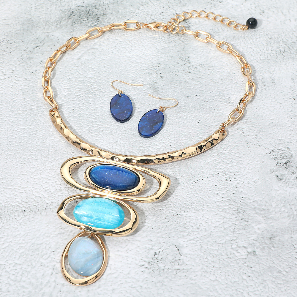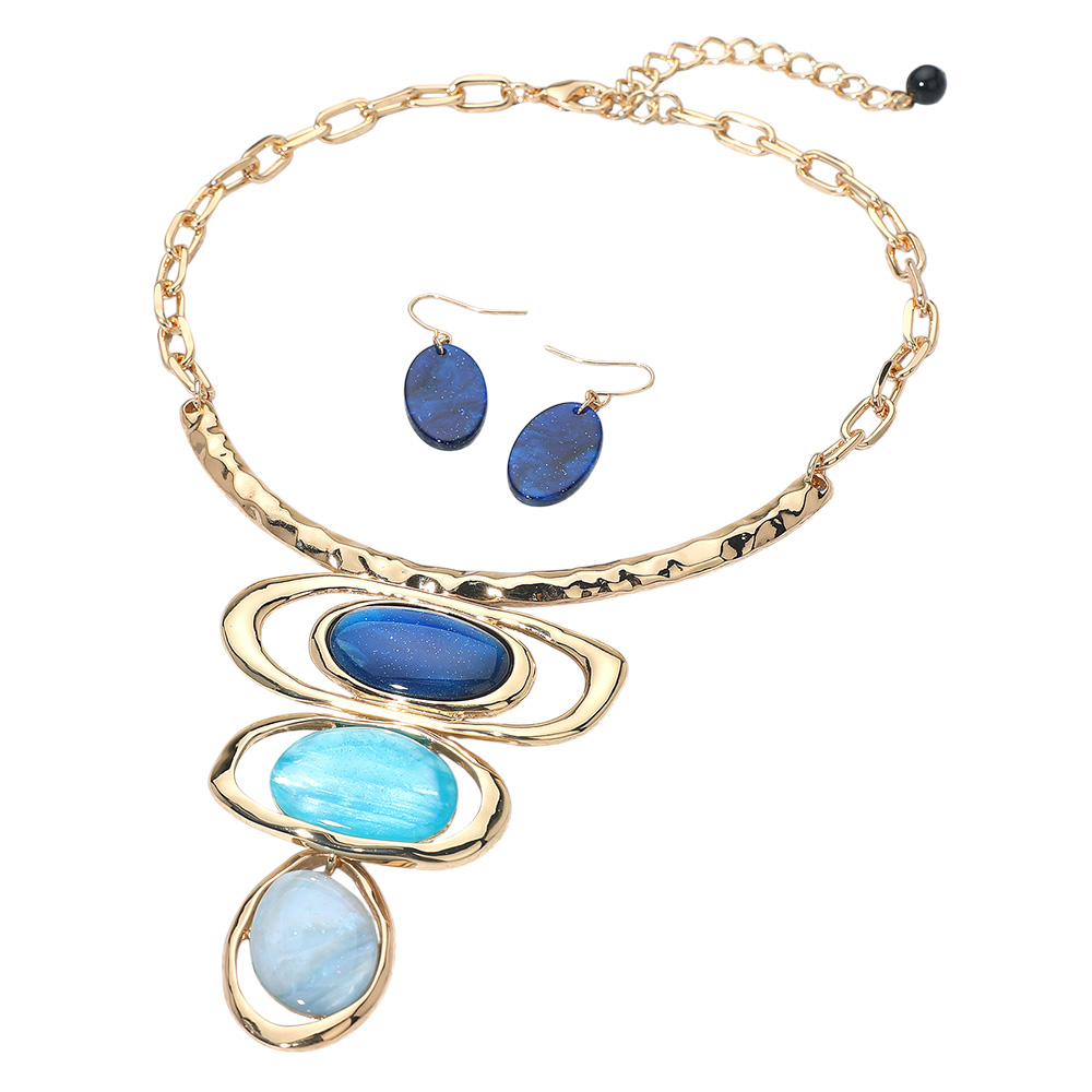 Details • Necklace Size : 17" + 4" L • Decor Size : 4" L • Earrings Size : 1.7" L • Make a statement with this bold necklace and earrings set featuring layered geometric pendants and matching drop earrings. The striking design enhances any outfit, perfect for parties, evenings, or special occasions. Add a modern artistic touch to your jewelry collection with this stunning set. • Lead and Nickel Compliant