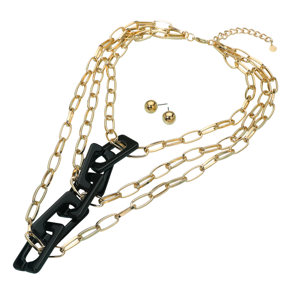 • Bold layered chain necklace designed with oversized links and paired with matching stud earrings for a polished finish. Perfect for making a statement, this versatile jewelry set complements casual and dressy looks, adding modern edge and sophistication to your accessory collection.