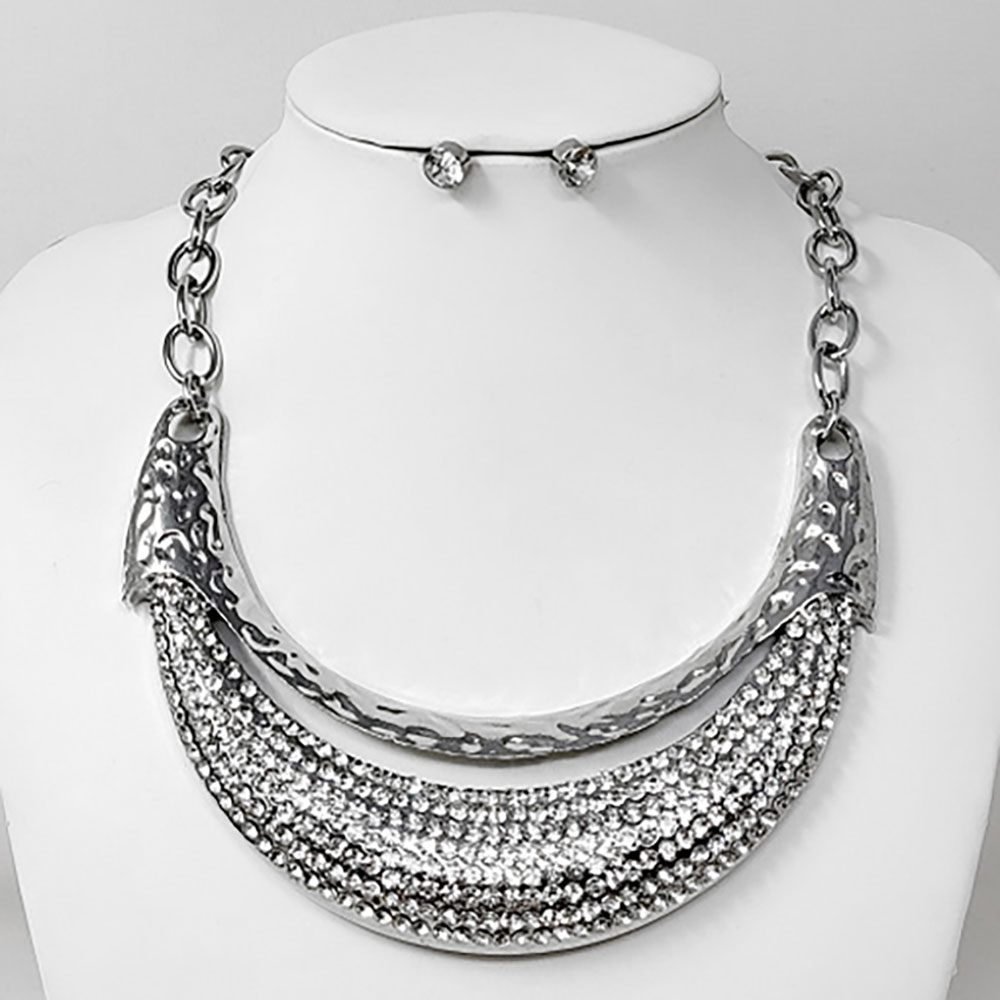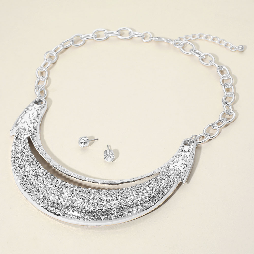 Details • Necklace Size : 23.5" + 3.5" L • Decor Size : 1.75" L • Earrings Size : 0.3" L • Elevate your style with this bold necklace set featuring a hammered chain and shimmering crystal detailing. Perfect for parties, weddings, and glamorous evenings. • Lead and Nickel Compliant