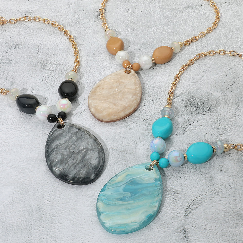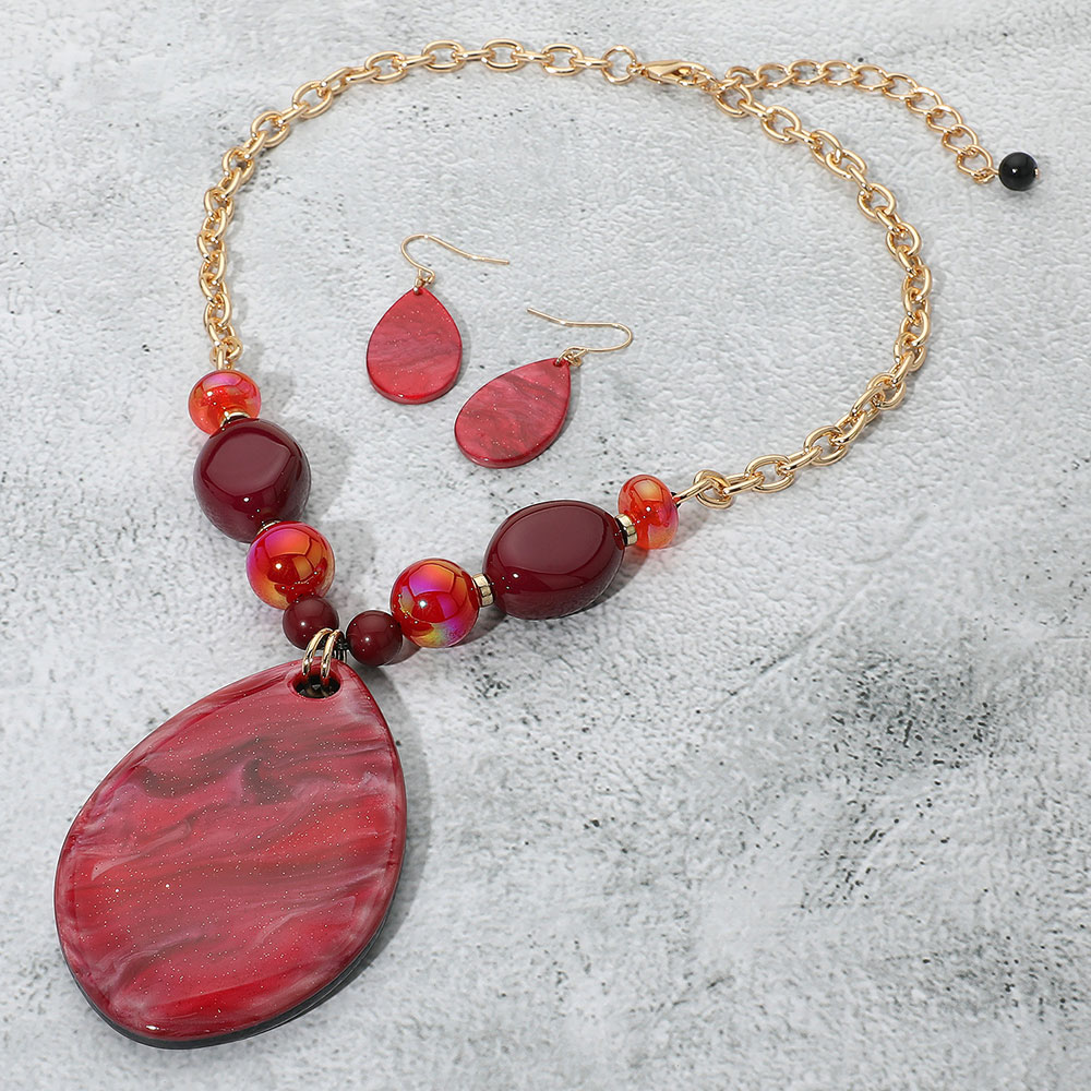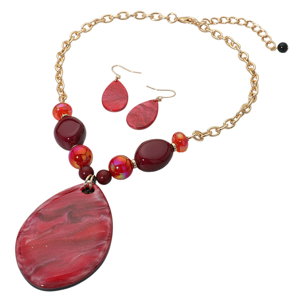 Details • Necklace Size : 20.5" + 3.5" L • Decor Size : 3.25" L • Earrings Size : 1.8" L • Stylish jewelry set featuring a bold teardrop pendant necklace and matching earrings with polished beads. Perfect for elevating any outfit, this set offers a refined, coordinated look ideal for casual chic or special occasions. • Lead and Nickel Compliant