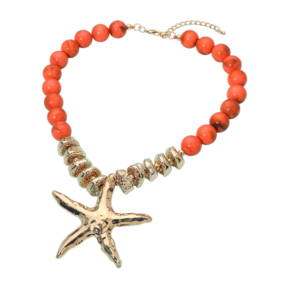 Details • Necklace Size : 22" + 3" L • Pendant Size : 3.25" X 3" • Bold beaded necklace featuring a sculpted starfish pendant and textured spacer accents for a coastal-inspired statement look. Perfect for vacations, beach outings, summer events or adding playful ocean-themed charm to everyday outfits with eye-catching style. • Lead and Nickel Compliant