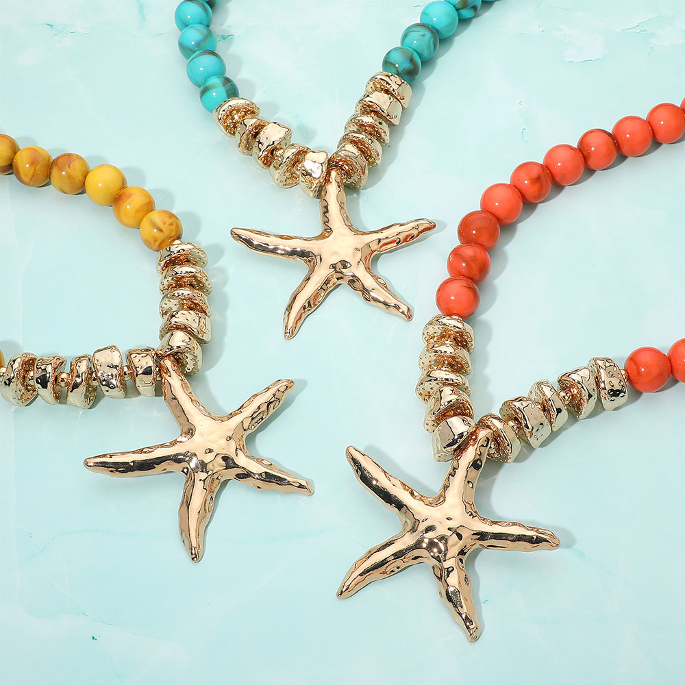• Bold beaded necklace featuring a sculpted starfish pendant and textured spacer accents for a coastal-inspired statement look. Perfect for vacations, beach outings, summer events or adding playful ocean-themed charm to everyday outfits with eye-catching style.