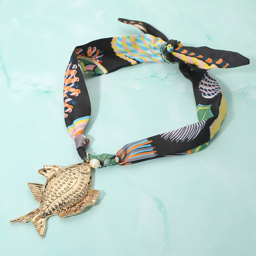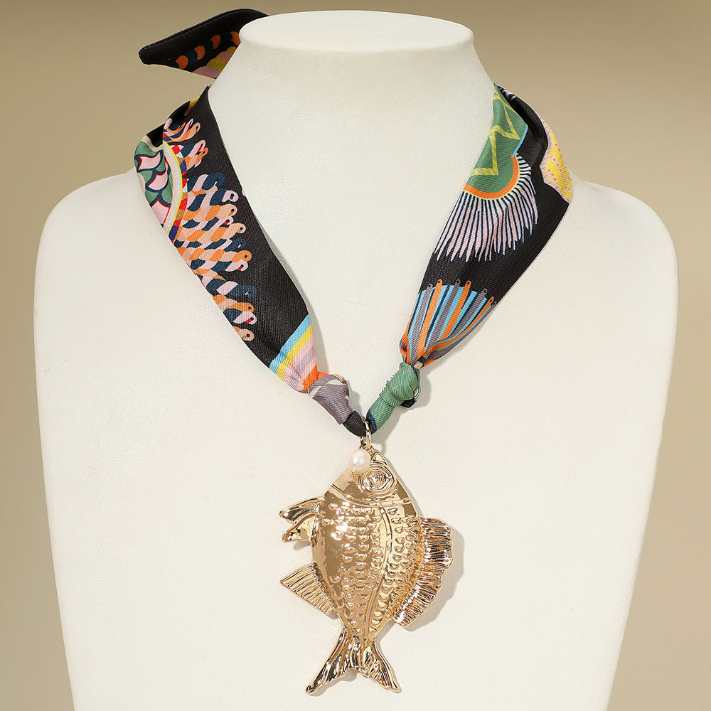 Details • Necklace Size : 31" L / Adjustable • Pendant Size : 2.5" X 3.5" • Print May Vary • Unique scarf necklace featuring a bold fish pendant and playful patterned fabric tie. Adjustable for comfort and style, this statement accessory combines chic charm with artistic flair, perfect for elevating everyday looks or standout fashion moments. • Lead and Nickel Compliant