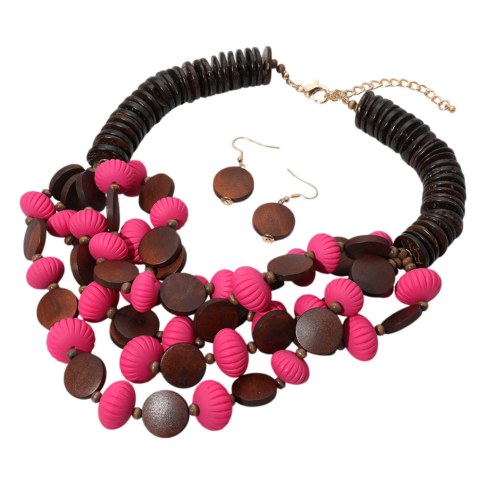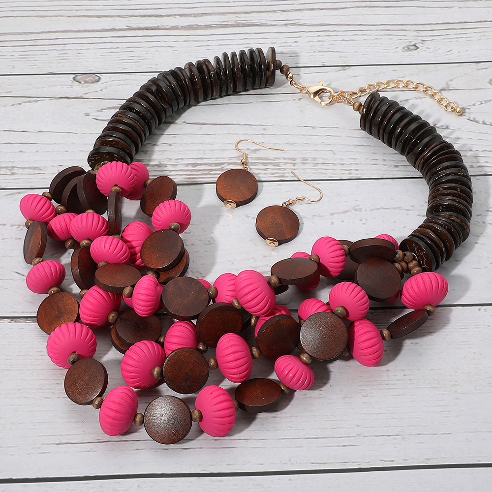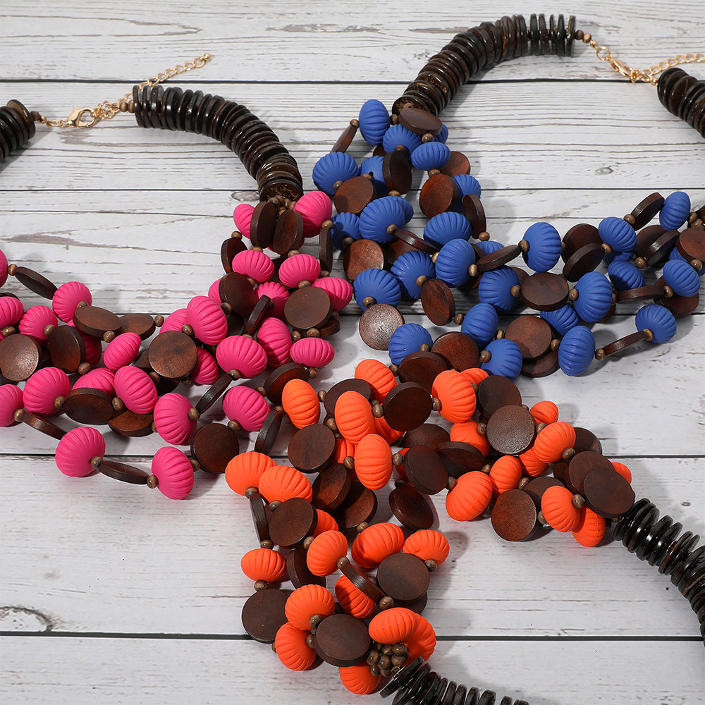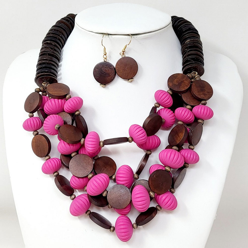 Details • Necklace Size : 20" + 3.5" L • Decor Size : 3.5" L • Earrings Size : 1.7" L • Turn heads with this striking multi-strand necklace featuring a mix of textured beads and vibrant accents. Paired with coordinating earrings, this bold statement set is ideal for elevating casual looks or adding artistic flair to any boho-chic outfit. • Lead and Nickel Compliant